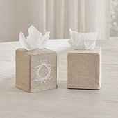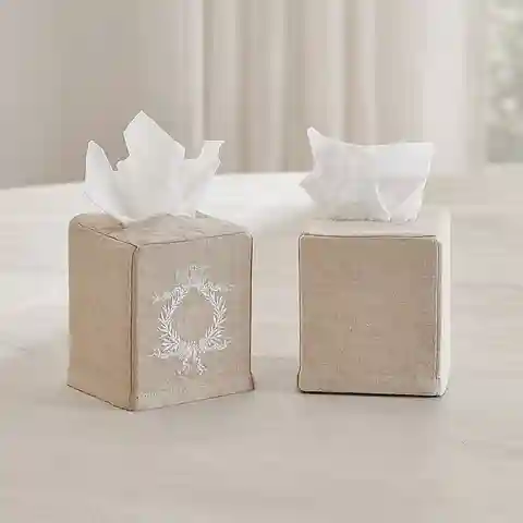 "Dress up your tissue boxes with our Embroidered Tissue Box Cover. Made of neutral natural linen and machine embroidered in your choice of three classic crests. Crest creates a beautiful frame for a monogram. Also available in Plain style. Embroidered Tissue Box Cover features: