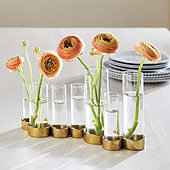 "Our Unity Vase is actually seven removable clear glass vases hinged together to create one beautiful centerpiece for your dining table or console. The serpentine base is made of aluminum and finished in warm brass. Vases stagger in height and size to create dramatic high/low contrast. Fill this uni...more