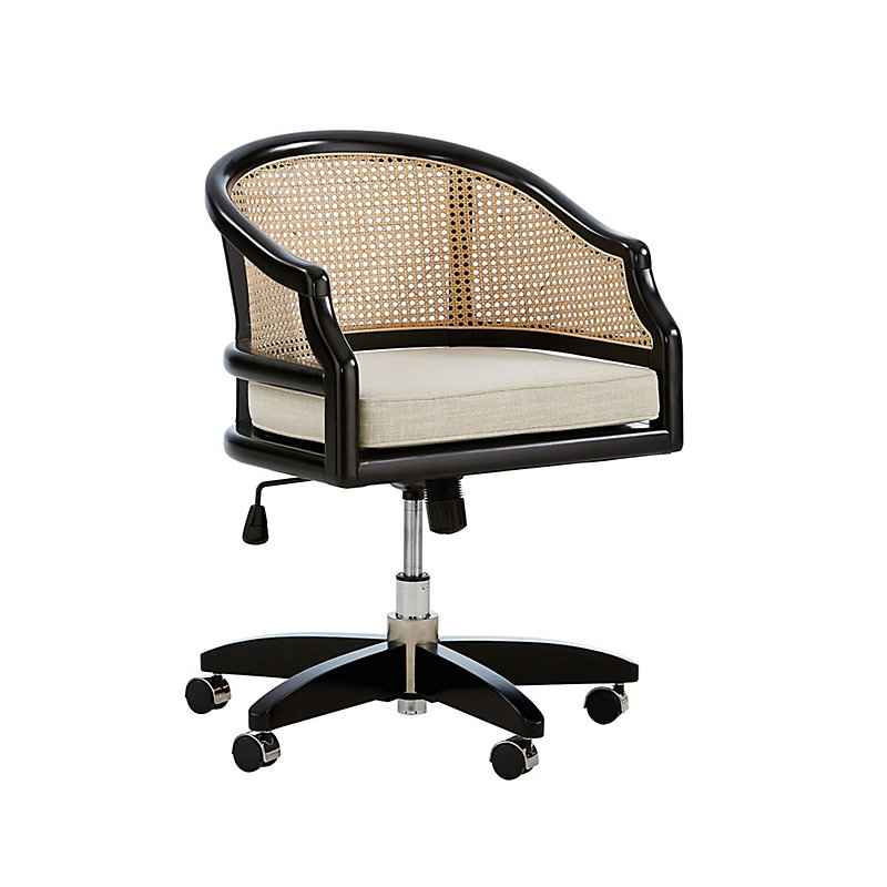 "The Kinley Desk Chair acts like a serious office chair, but looks like its on vacation. The shapely frame is crafted of substantial hardwood with airy, caned barrel back for wrap-around support. Included natural linen blend seat cushion is extra thick for all-day comfort. Seat swivels a full 360 de...more