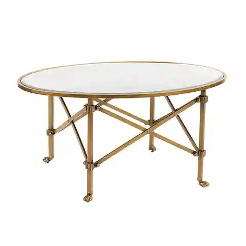 "A stylish update on the classic French gueridon, this oval coffee table is crafted of metal with classic claw-footed legs, ""X"" stretchers and beveled mirror top.Olivia Coffee Table features:Classic claw-footed legs. ""X"" stretchers for support. Fully assembled."