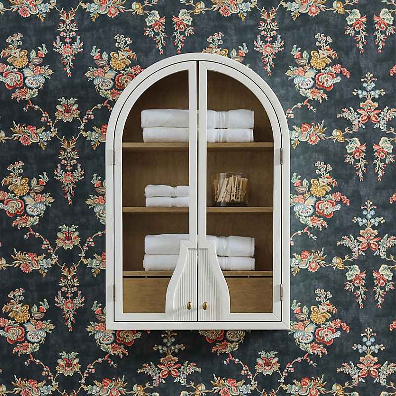 "Our pretty Faro Wall Cabinet takes a fresh look at the traditional apothecary cabinet. The gracefully arched case is crafted of hardwood with clean white finish outside and warm birch stain inside. Clear glass doors with reeded panel details and antique brass latch pulls showcase everyday essential...more