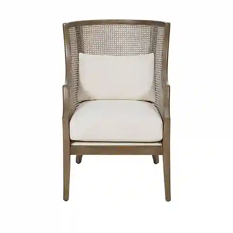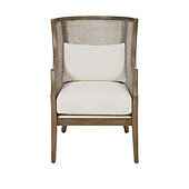 "With its exposed cane wrap-around back, our cozy Finn Caned Chair is the perfect fireside companion or bedroom chair. The gracefully curved frame is handmade of hardwood, and designed to showcase the basket weave caning on the back and arms. Seat and bolster cushions are hand finished in Natural Li...more