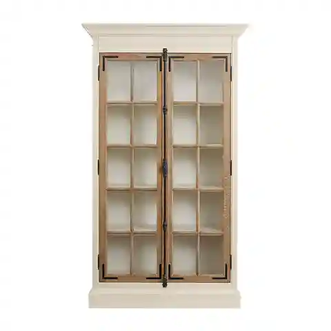 "Rising to a dramatic seven feet in height, our Salerno Glass Door Cabinet is based on a favorite antique from our own collection. Double French casement doors showcase dishes, linens or books and secure with vintage bar latch. Cream finish features Oak door panels. Salerno Glass Door Cabi...more