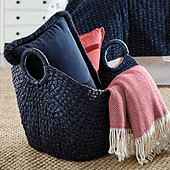 "We love woven storage baskets to hold everything from our favorite catalogs and magazines to toys, throws and kindling. Our versatile Lula Basket is hand woven of strong water hyacinth to hold its shape, and finished in deep navy for a welcome pop of color and natural texture. Lula Hyacinth Basket ...more