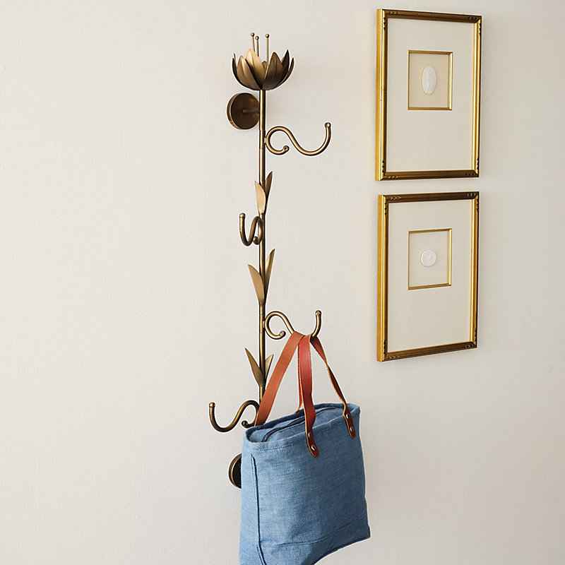 "A charming reminder of spring when it's still cool enough for jackets. Our pretty Orleans Wall Hook is delicately hand sculpted of iron with blooming floral and leaf details finished in warm antique brass. Three hooks with rounded tips pivot from left to right on the slender stem, making it easy to...more