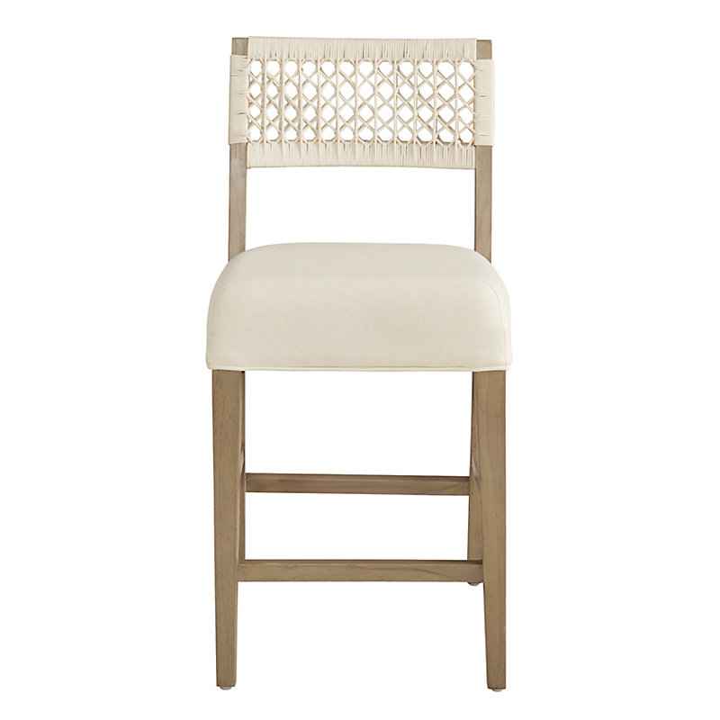 "A delectable blend of mixed natural materials makes our Kallie Woven Counter Stool a 5-star choice for casual kitchen island dining. The distinctive back is beautifully hand woven of fine off white rope in a double-sided design reminiscent of macrame. Comfortable, deeply padded seat is upholstered ...more