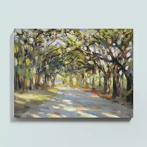 "The common denominator of my work is light, explains celebrated Charleston artist, Rick Reinert. In this sun-dappled landscape, Rick guides the viewer through a cathedral of Southern oaks with patches of golden light. Southern Oaks Stretched Canvas features: