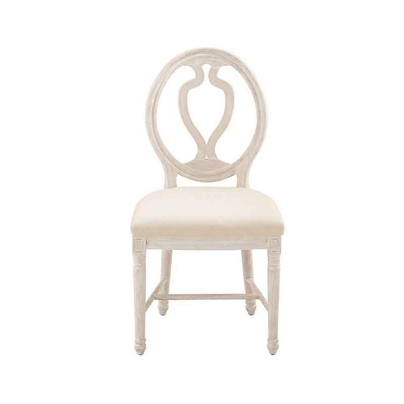 "Our Liesel Dining Chair was inspired by a Swedish Gustavian antique. The softly curved shield back is carved in an open vase design that's just a pretty from behind. Legs have ring turnings and an ""H"" stretcher to accentuate the timeless silhouette. Richly padded seat is upholstered in our cleana...more