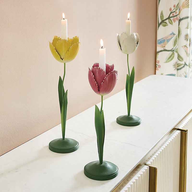 "Brighten your spring and summer tables with these pretty Tulip Candleholders. Each is beautifully hand crafted of iron with resin base and hand painted in joyful, fresh-from-the-garden hues. The ruffled bloom candle cup holds a standard taper. Mix and match styles to create a colorful centerpiece p...more