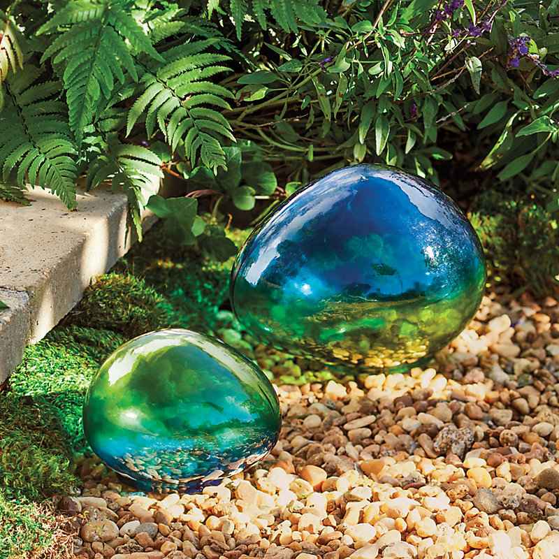 "Gorgeous color to brighten your garden all year round. Our Glass Garden Stones are made of mouth-blown glass and colored in an ombre of iridescent blue and green hues. Tuck this whimsical outdoor garden decor in among your plants and flowers to create colorful little surprises for guests to discove...more