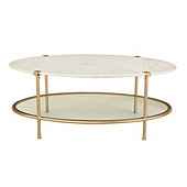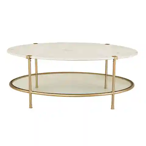 "A beautiful blending of luxe finishes, our Melrose Coffee Table creates an elegant focal point in the living room or bedroom sitting area. The graceful oval silhouette is handmade with white marble top elevated on a slender, bracketed champagne finish metal frame. A clear glass shelf beneath create...more