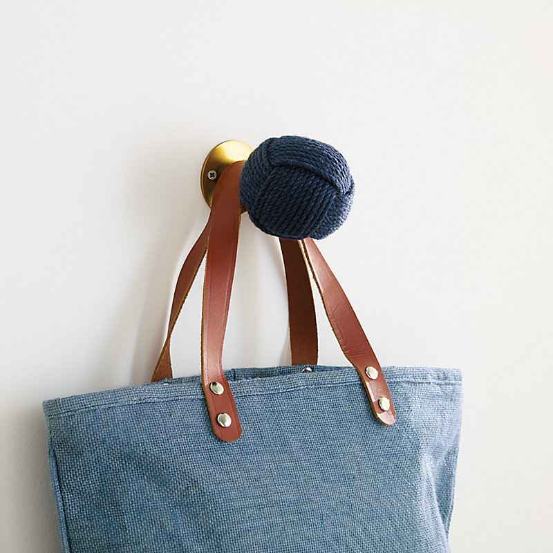 "A fun touch of coastal texture for your mudroom, entryway or bath. Our Nautical Rope Hook is hand woven in a rounded knot of navy cotton rope and mounted on a hardy antique brass extension rod with matching back plate. Nautical Rope Hook features: Navy cotton rope. Antique brass finish. Handmade ...more