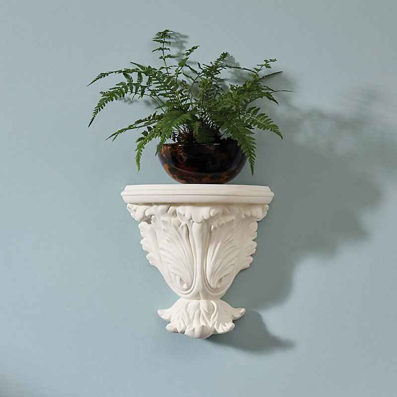 "Our classically inspired Andreas Wall Bracket elevates petite art or a favorite bowl with architectural drama. Especially striking paired beside a doorway or grand mirror, the demilune silhouette is hand cast of plaster white urethane with opulent, scrolled acanthus leaf details. Andreas Wall Brac...more