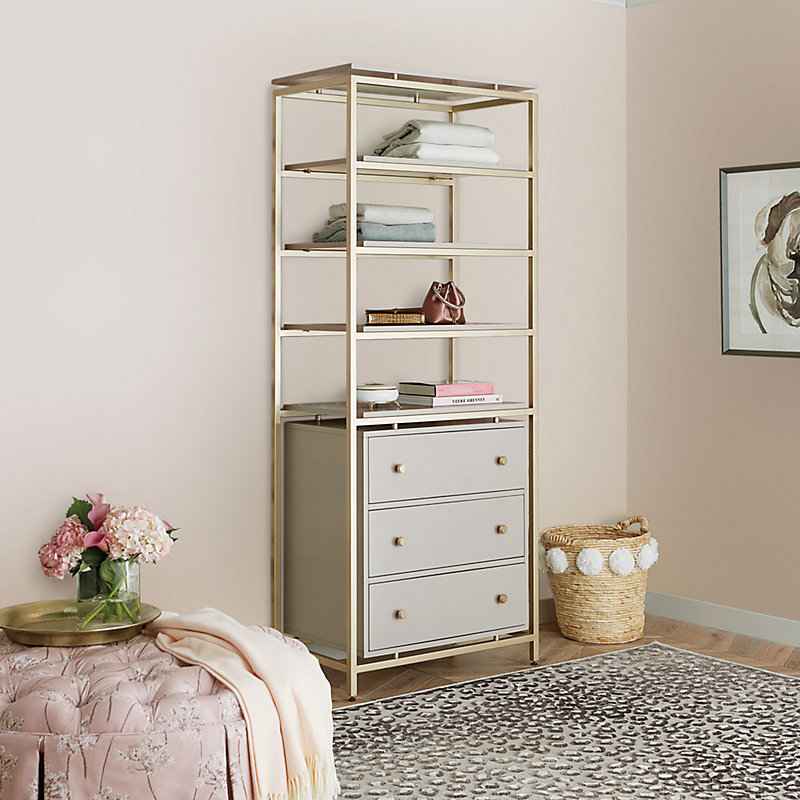 "Create the glamorous closet of your dreams with our elegant Avery closet system. Mix and match the free-standing modular components to custom fit your wardrobe and space. Frames are handmade of iron with satin champagne finish and light gray wood. Drawers & Shelves unit has four fixed shelves on to...more