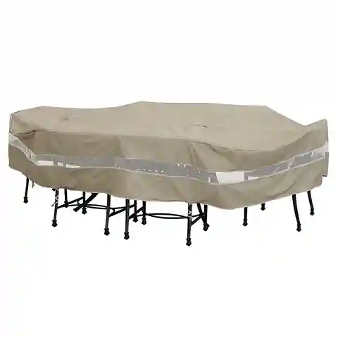 "Good patio furniture is a long-term investment. Protect yours with our tan Outdoor Oval or Rectangular Table & Chairs Cover. We guarantee it to be one of the most rugged, well-designed Outdoor Furniture Covers on the market. No matter where you live, this weather-defying cover can take it from rel...more