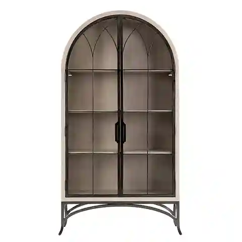 "Our glass door Aris Glass Door Cabinet was inspired by a graceful European Gothic window. Cabinet is handmade of mango wood and mahogany with custom-welded, bronze metal frame doors and matching splayed feet. Slender silhouette and shallow 14"" depth are perfect for narrow spaces or dining rooms wh...more