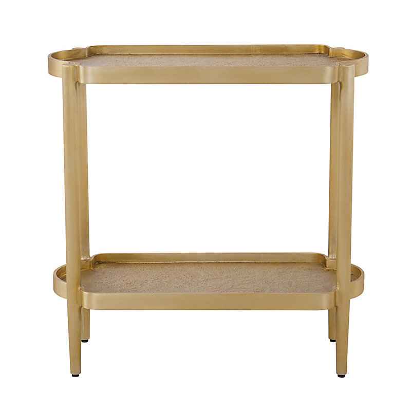 "With its slender silhouette, our Krista Accent Table nestles nicely beside an armchair or between occasional chairs in the living room or bedroom. The shapely scalloped top and bottom shelf are recessed for a tray effect and elevated on round, tapered legs. This pretty side table is sculpted of cas...more