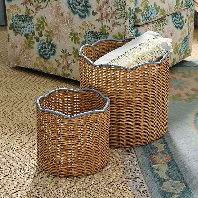 "Versatile, go-anywhere storage with a stylish edge. Our Lulu Scalloped Baskets are hand woven of natural rattan wicker over metal frames and finished with pretty cornflower scalloped edges. Small size makes a great waste basket. Large size is perfect for laundry, kids' toys, or dressing up a faux p...more
