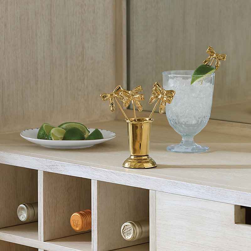 "Bows are popping up everywhere this season, from fashion shows to cocktail bars. Our Bow Cocktail Picks help you turn every cocktail into a special gift. Six cocktail picks are handmade of brass and metal with pretty bow detail and lustrous gold finish. Matching metal holder has a dressy turned bas...more