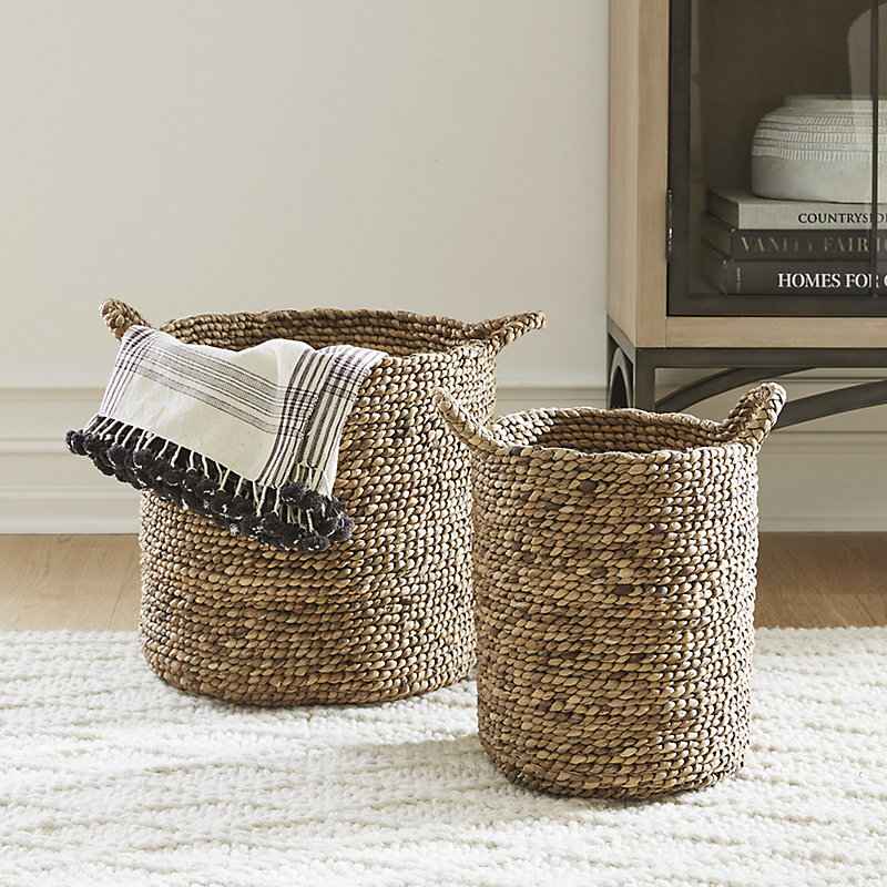 "When it comes to easy portable storage, a nested pair of sturdy braided baskets is a must-have for a busy family. Our Braided Baskets are hand woven in thick braids of natural water hyacinth to hold their classic shape. Handles are double braided for extra strength and a sure grip. These round wove...more