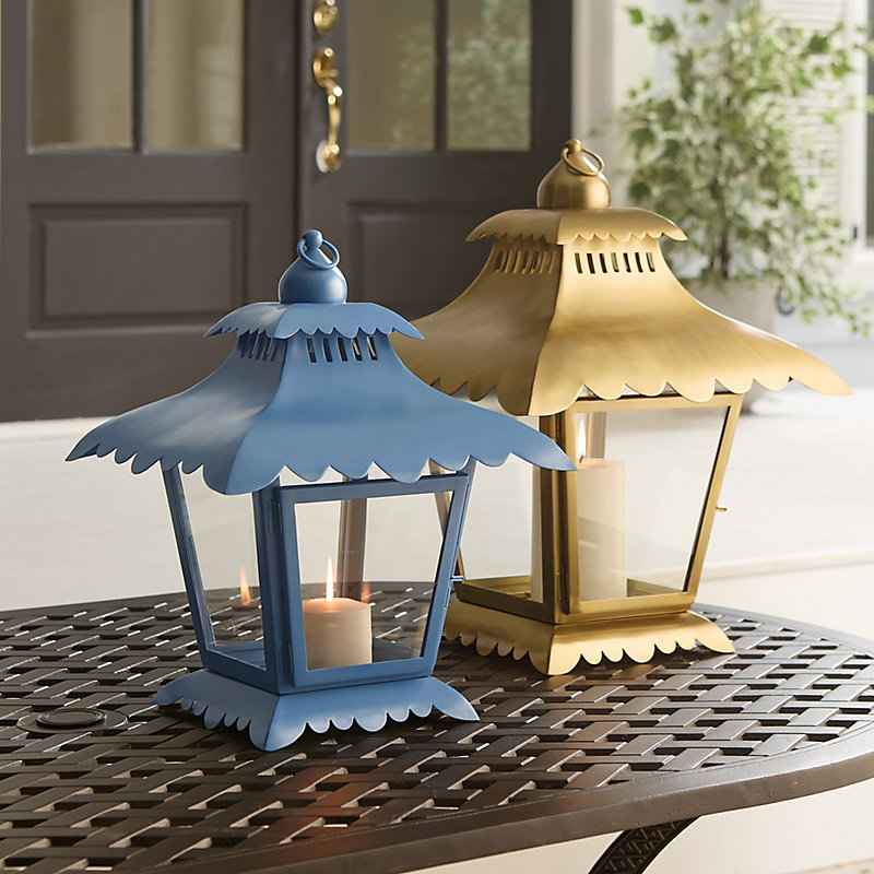 "Chinoiserie-inspired charm to light up your outdoor living spaces. Our Newport Lantern is hand crafted of outdoor-safe, powder-coated steel with playfully scalloped pagoda top and base. Clear glass panes allow plenty of romantic light from your own pillar candle. One side has a hinged door with lat...more