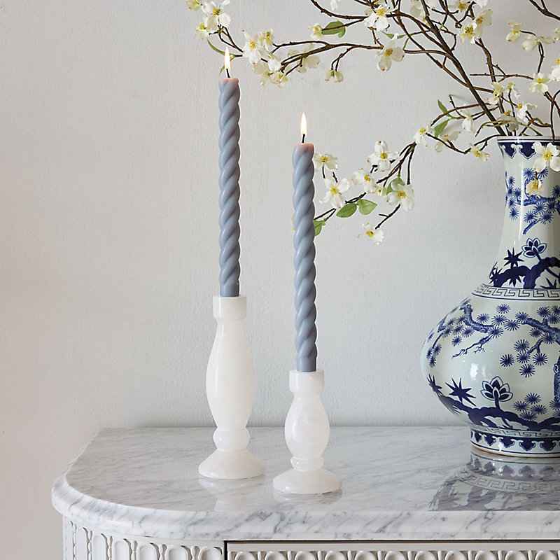 "Sculpted from translucent alabaster, our Alabaster Taper Candleholders appear to glow from the inside out when lit by your own taper candle. The soft white color and updated silhouettes blend effortlessly with any decor. Buy both sizes to display in staggered heights down the center of your dining ...more