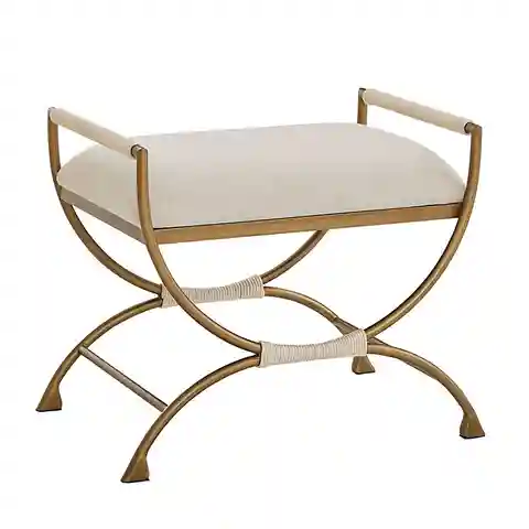 "With its chic hourglass silhouette, our Connelly Upholstered Bench looks elegant tucked beneath a vanity, as a small entry bench, or paired at the end of bed. The sleek brass finish frame is hand wrapped in natural cording at the legs and arms for rich contrasting texture. Uniquely shaped feet acce...more
