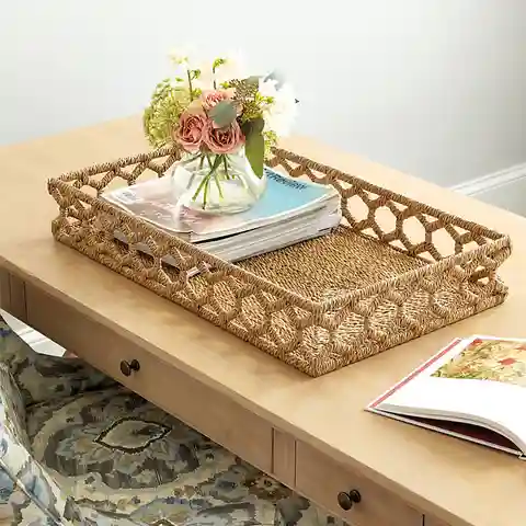 "Hand-woven tray stylish enough to show off anywhere in your home. Our Honeycomb Woven Tray is hand woven of natural bankuan, a cultivated tropical grass, over heavy wire with sturdy wood composite bottom. Honeycomb Woven Tray features: