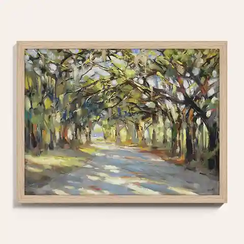 "The common denominator of my work is light, explains celebrated Charleston artist, Rick Reinert. In this sun-dappled landscape, Rich guides the viewer through a cathedral of Southern oaks with patches of golden light. Southern Oaks Framed Canvas features: