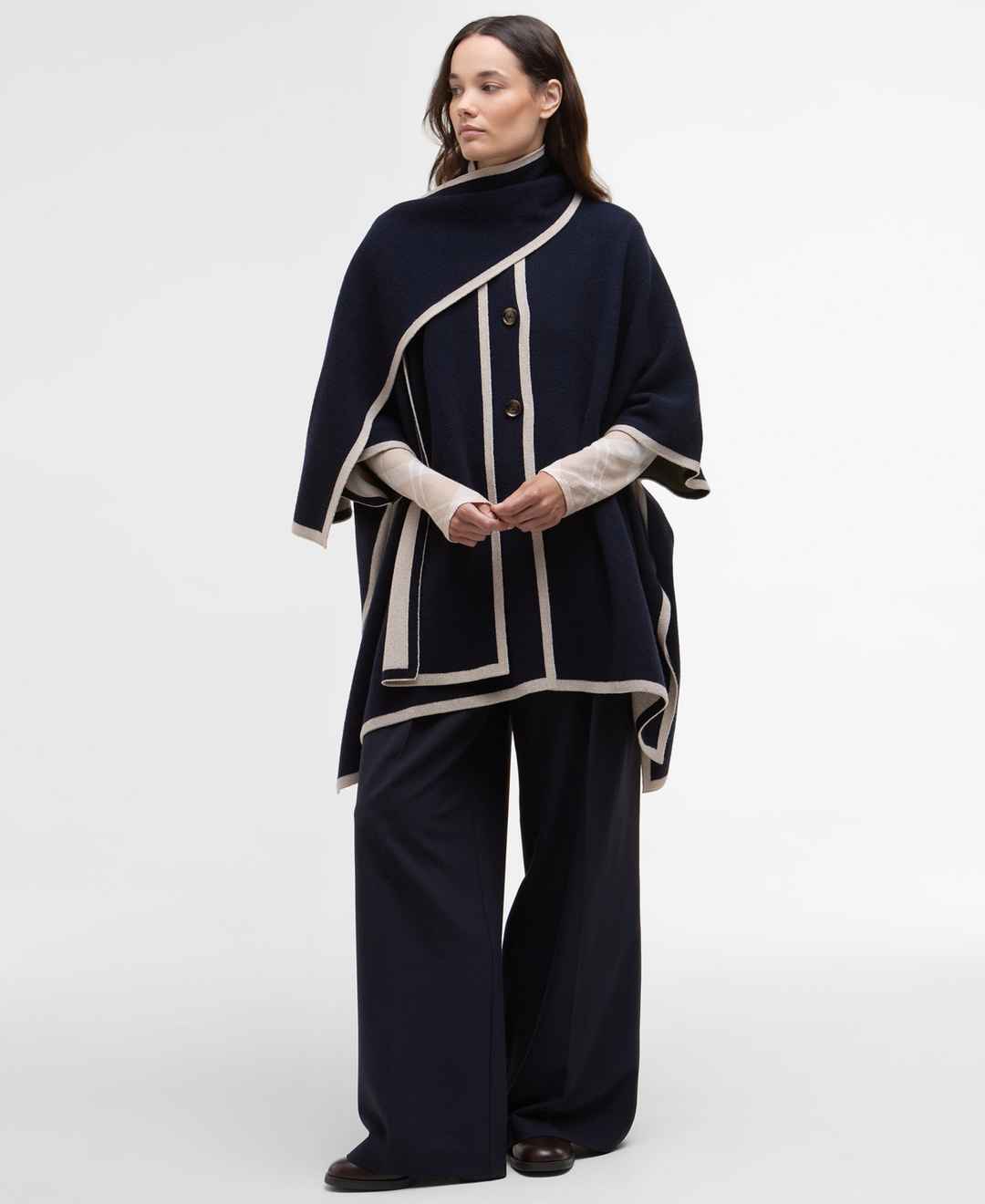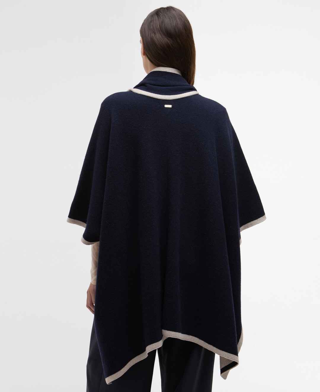Chic layering made effortless, this Barbour cape features a knitted design with a coordinating scarf. It offers contrast trim, side splits, and subtle logo branding at the back neck for a stylish, versatile finish.