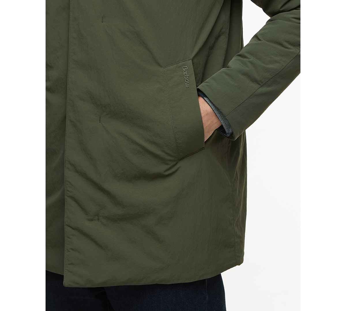 Featuring a showerproof longline design, this Barbour mac jacket includes front welt pockets and a tartan inner back yoke. The concealed button fastening offers a sleek and polished aesthetic.