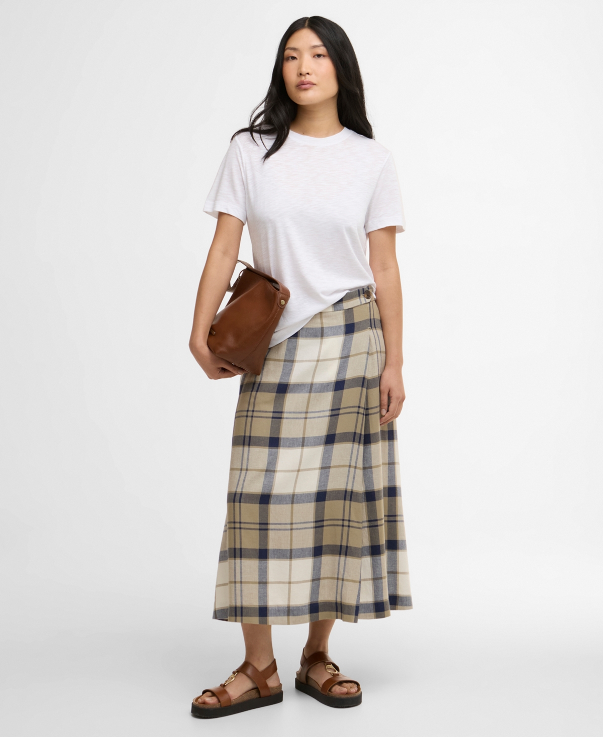 Classic tartan styling is showcased in this Barbour Ballina midi skirt, which features an A-line silhouette for a flattering, structured look. Designed with a mock wrap front and a center split for added ease, it also features side-entry pockets for everyday convenience.
