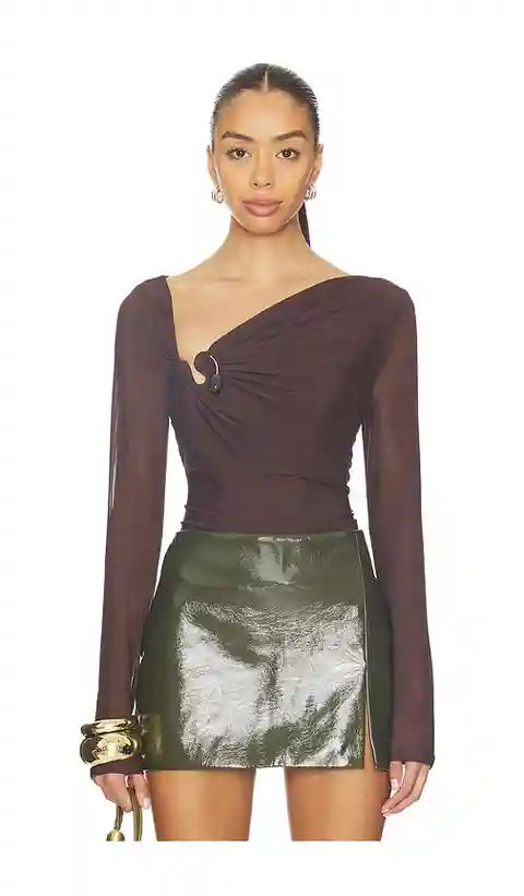 Bardot Marisol Asymmetric Mesh Top in Chocolate. - size L (also in M, S, XL, XS)