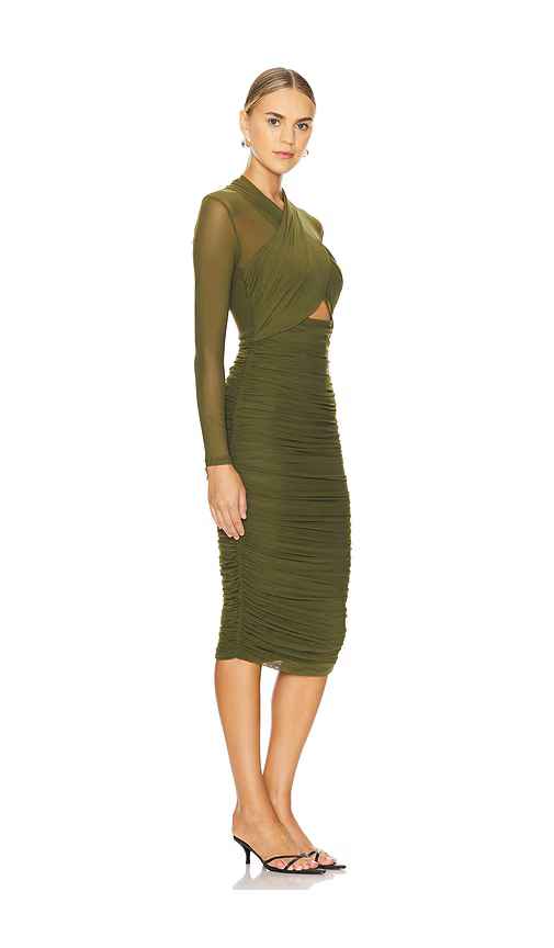 Bardot Aliyah Dress in Army. - size L (also in M, S, XL, XS) Bardot Aliyah Dress in Army. - size L (also in M, S, XL, XS) Self: 92% nylon 8% elastane Lining: 100% polyester. Made in China. Hand wash. Fully lined. Exposed back zipper closure. Cut-out design. Ruched mesh fabric. BARD-WD819. 56305DB. L...more