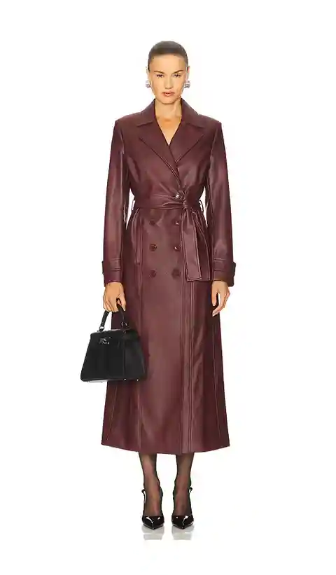 Bardot Faux Leather Longline Coat in Burgundy. - size L (also in M, S, XL, XS) Bardot Faux Leather Longline Coat in Burgundy. - size L (also in M, S, XL, XS) Self 1: 100% polyurethane Self 2: 55% polyester 45% cotton Lining: 97% polyester 3% elastane. Hand wash cold. Double breasted front button clo...more