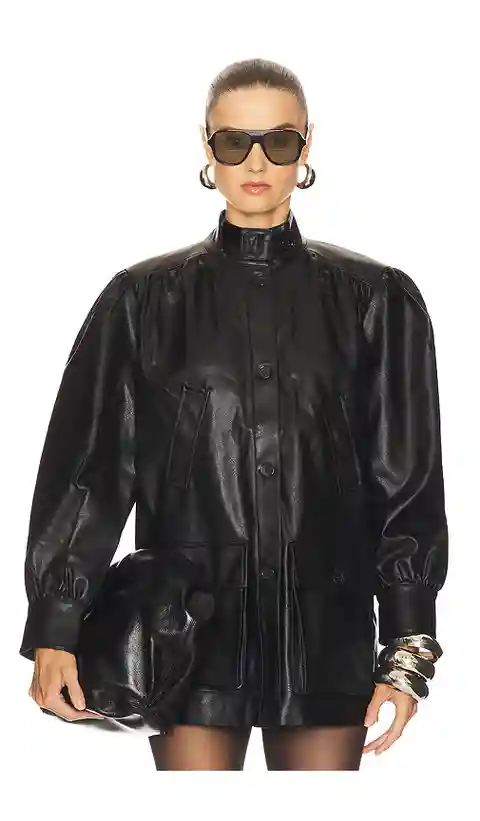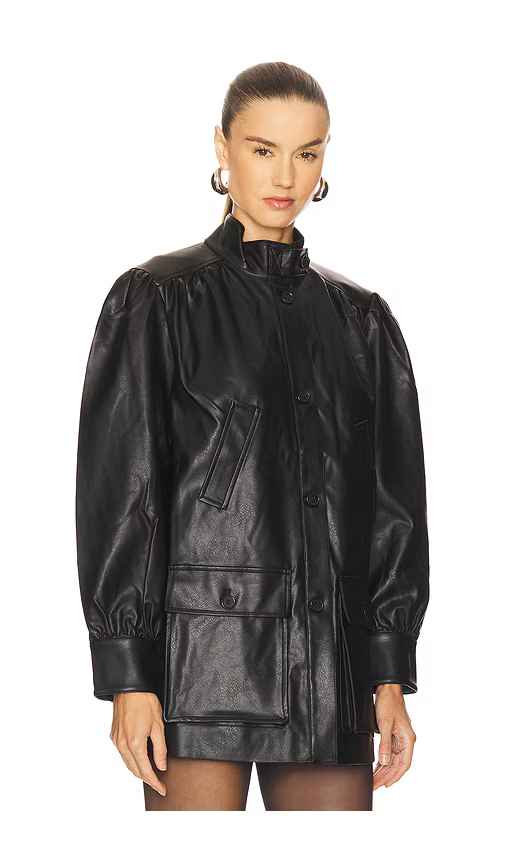 Bardot Clements Faux Leather Jacket in Black. - size L (also in M, S, XL, XS) Bardot Clements Faux Leather Jacket in Black. - size L (also in M, S, XL, XS) Self: 100% polyurethane Lining: 97% polyester 3% elastane. Dry clean. Front button closure. 4-pocket styling. Faux leather fabric with button cu...more