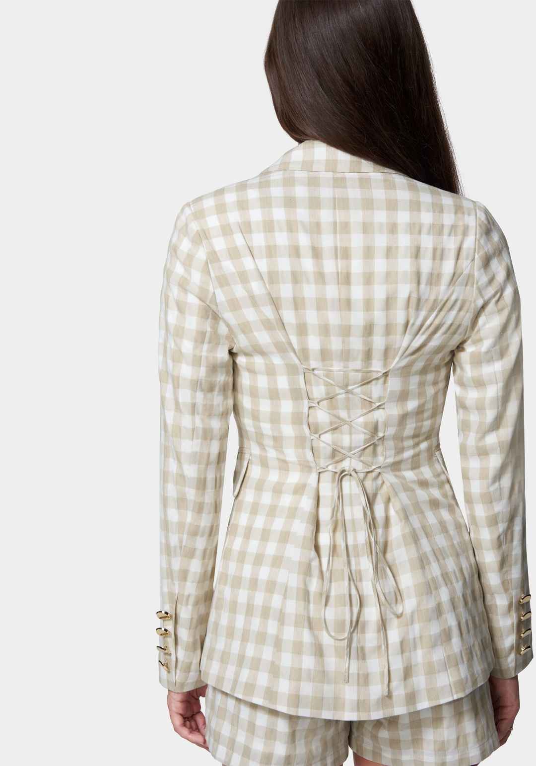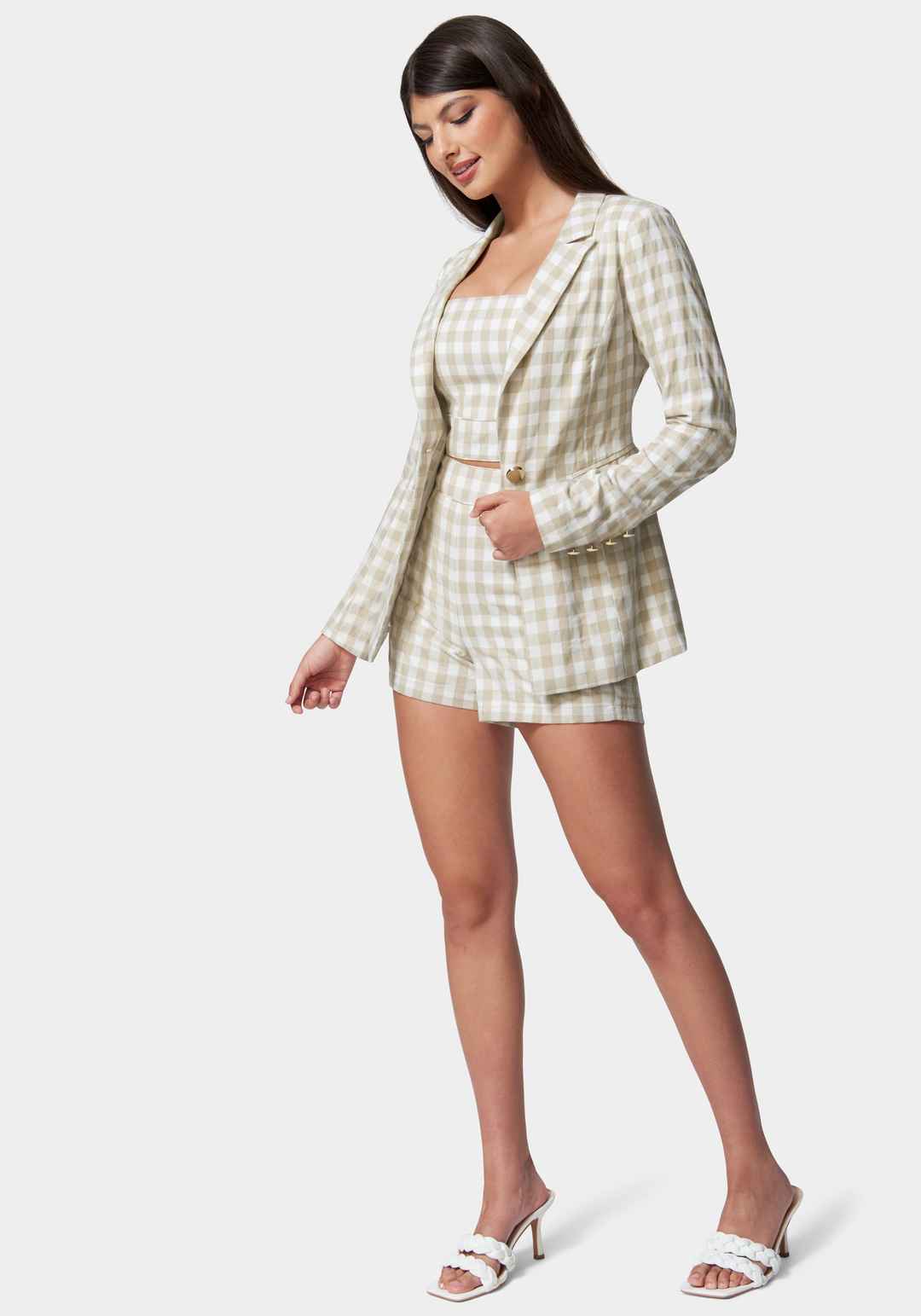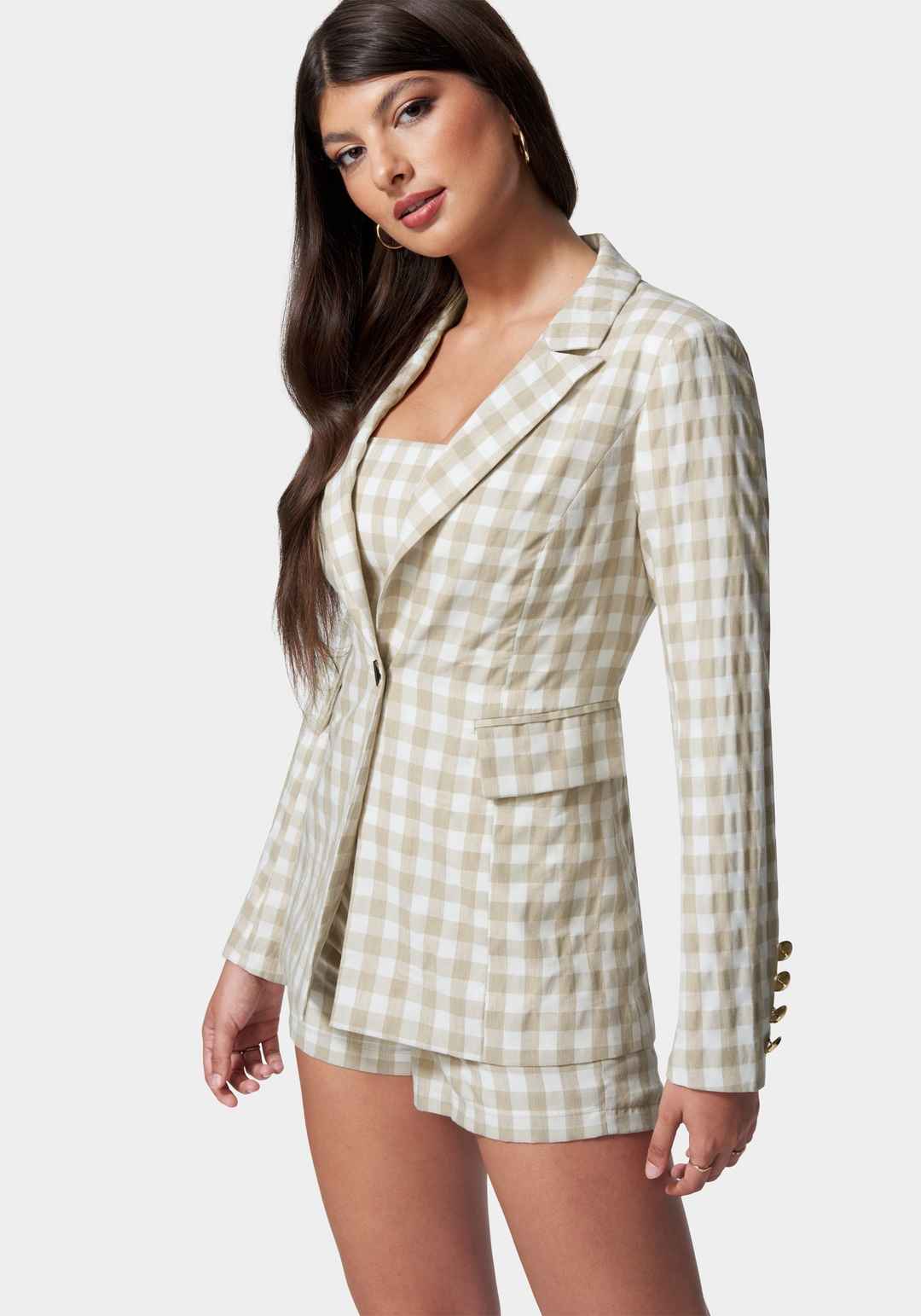 Check, please. This tailored jacket is the perfect summer staple with its all-over gingham print, single-button closure, and relaxed fit. Body: 100% Cotton; Lining: 98% Polyester, 2% Spandex Dry clean only Imported 28" Length | Bebe Women's Gingham One Button Tailored Jacket, Size 10 in White Alyssu...more