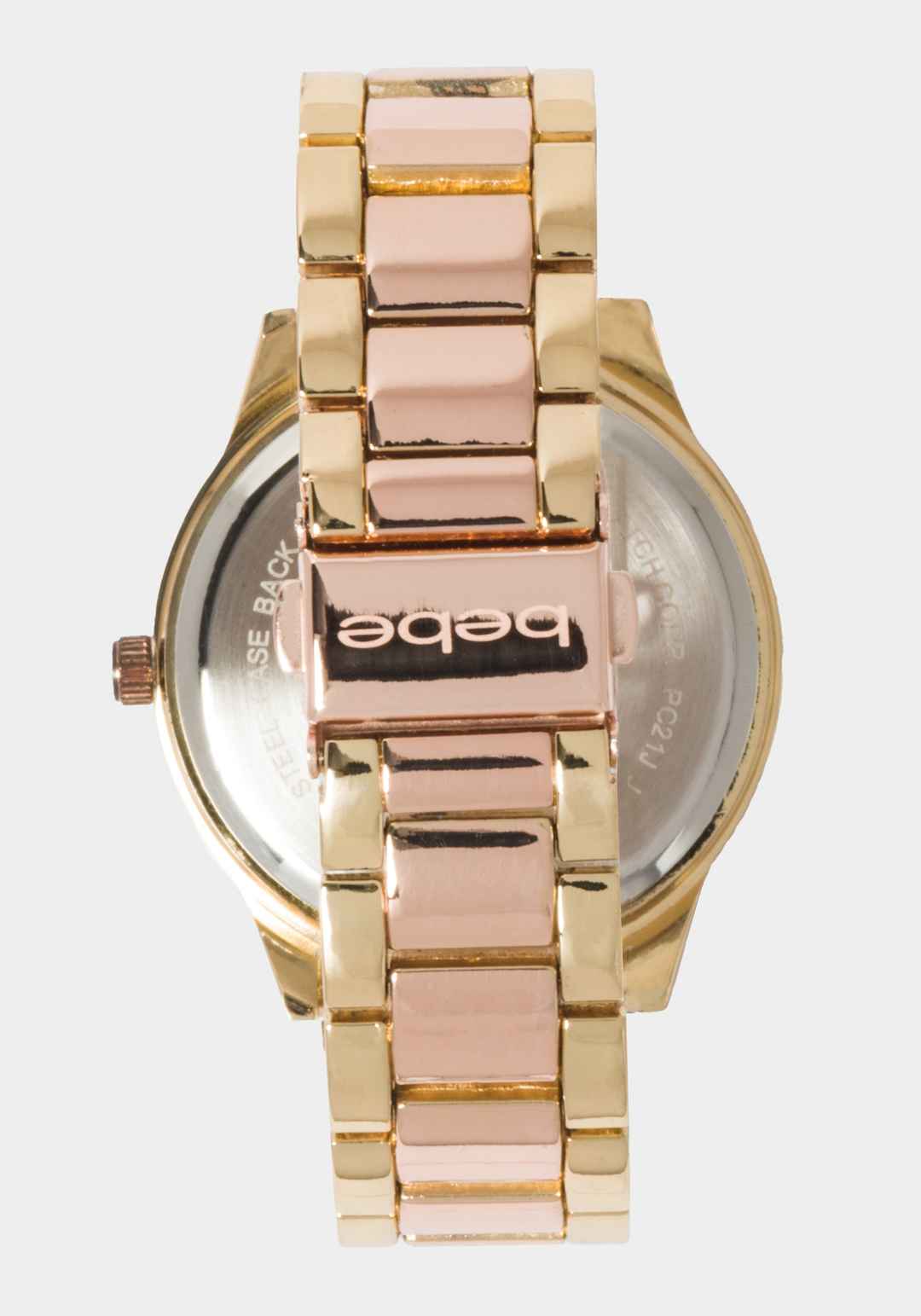 Sporty yet sophisticated, this two-tone rose gold bracelet design features a crystal bezel and hour markers, complete with clear pav crystals along the chain. Spot clean Imported | Bebe Women's Rose Dial Crystal Bezel Watch in Two-Tone Rose Gold-Gold