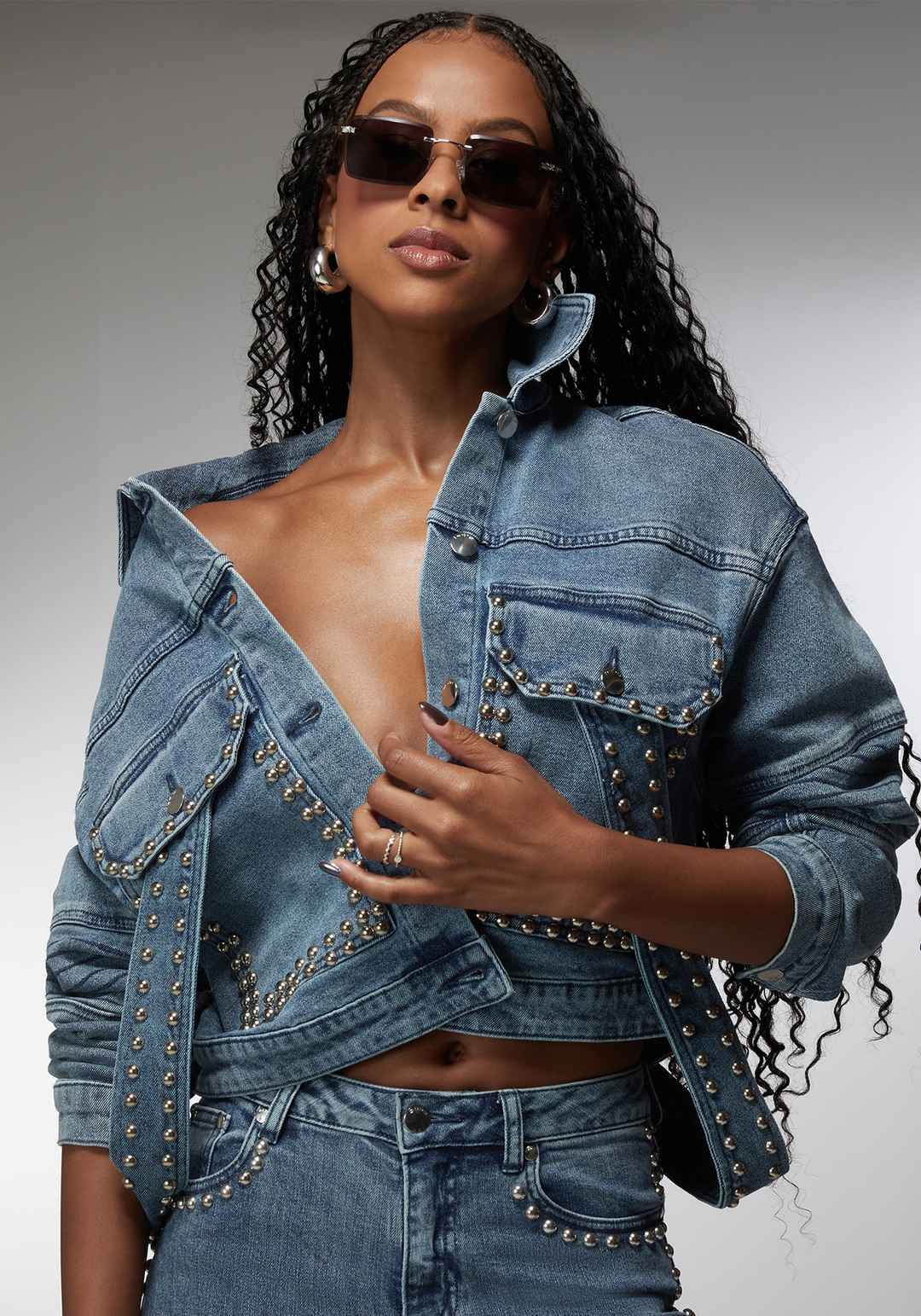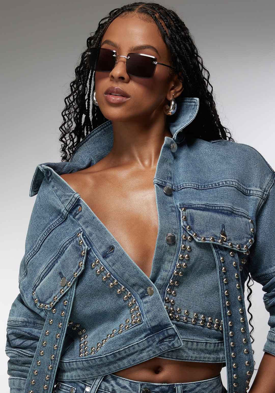 Shine like Ciara. Grab these sleek rimless square sunglasses featuring shiny silver temples, black acetate temple tips, and a signature double "b" for bebe logo. Size: Eye Size 54mm. Bridge Width 19mm. Temple/Arm Length 140mm Care Instructions: Use lens spray or a mild liquid soap/water and wipe wit...more