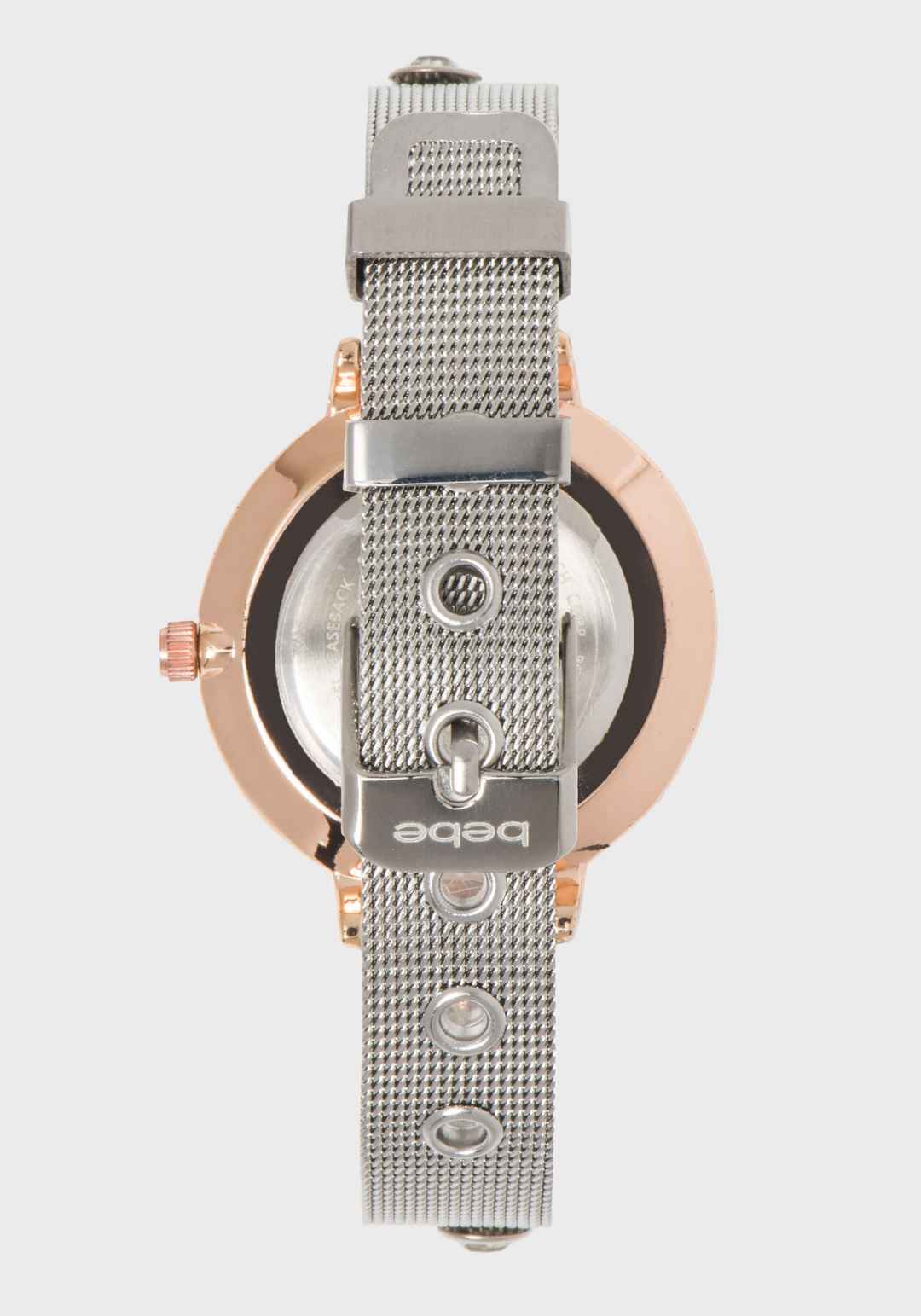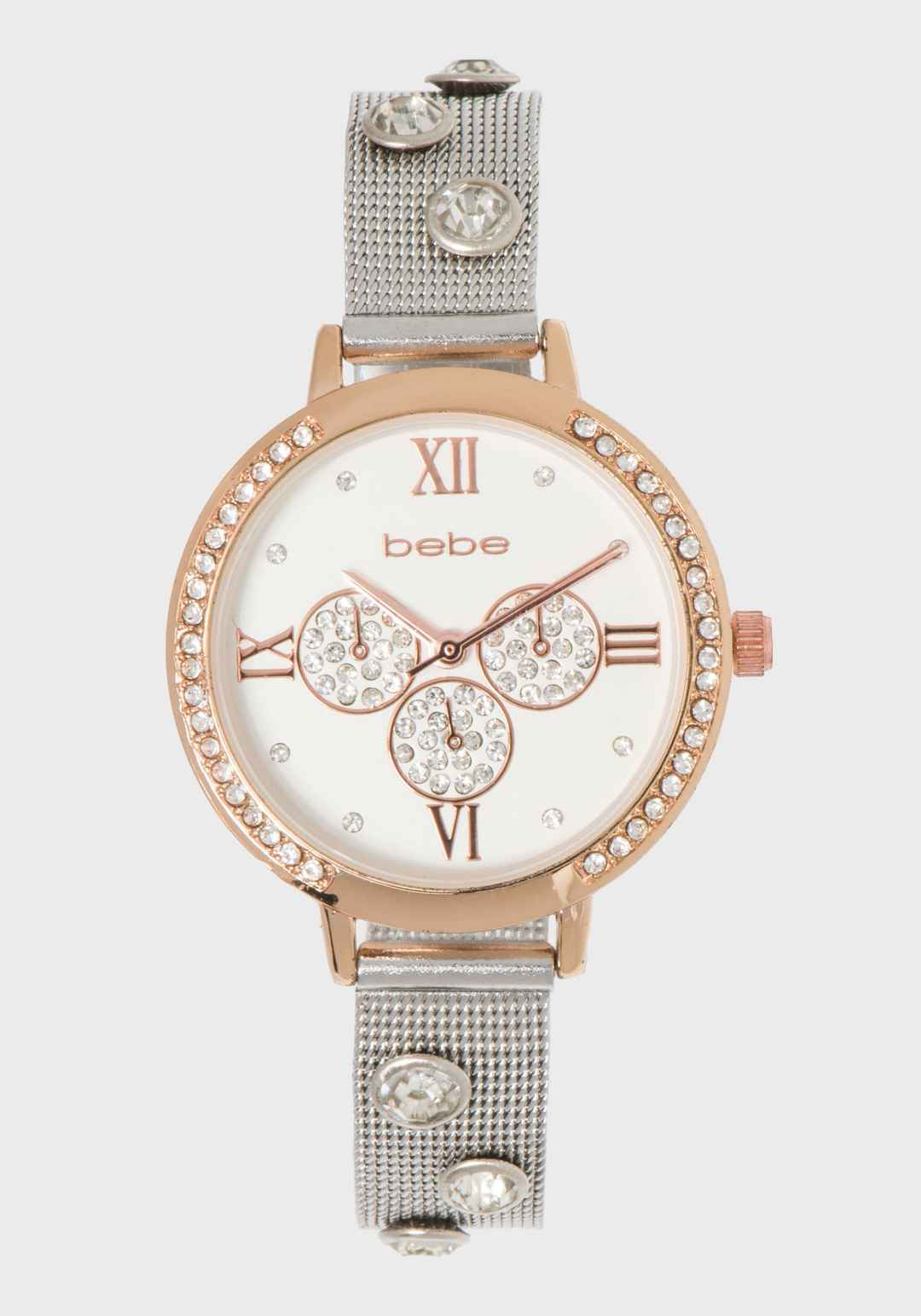 This two-tone crystal watch features a sleek metallic mesh band. Endlessly versatile, this piece pairs effortlessly with jeans or your best evening wear. Alloy case, stainless steel mesh strap, brass dial Wipe clean Imported | Bebe Women's Two-Tone Crystal Band Watch Metal