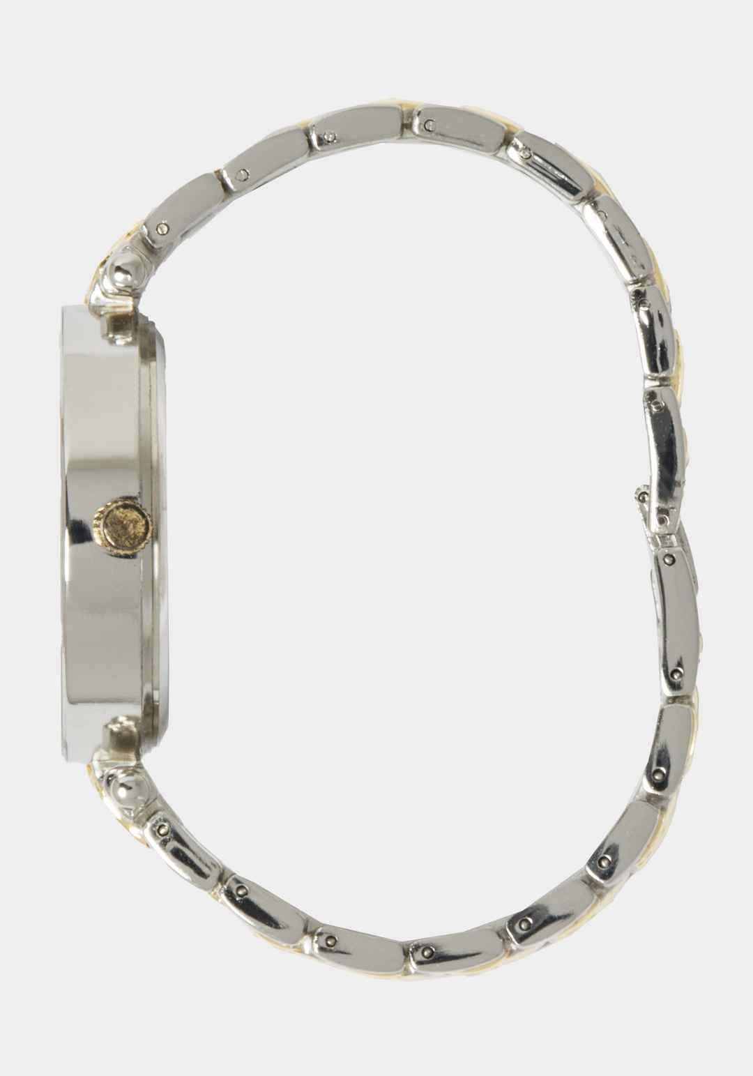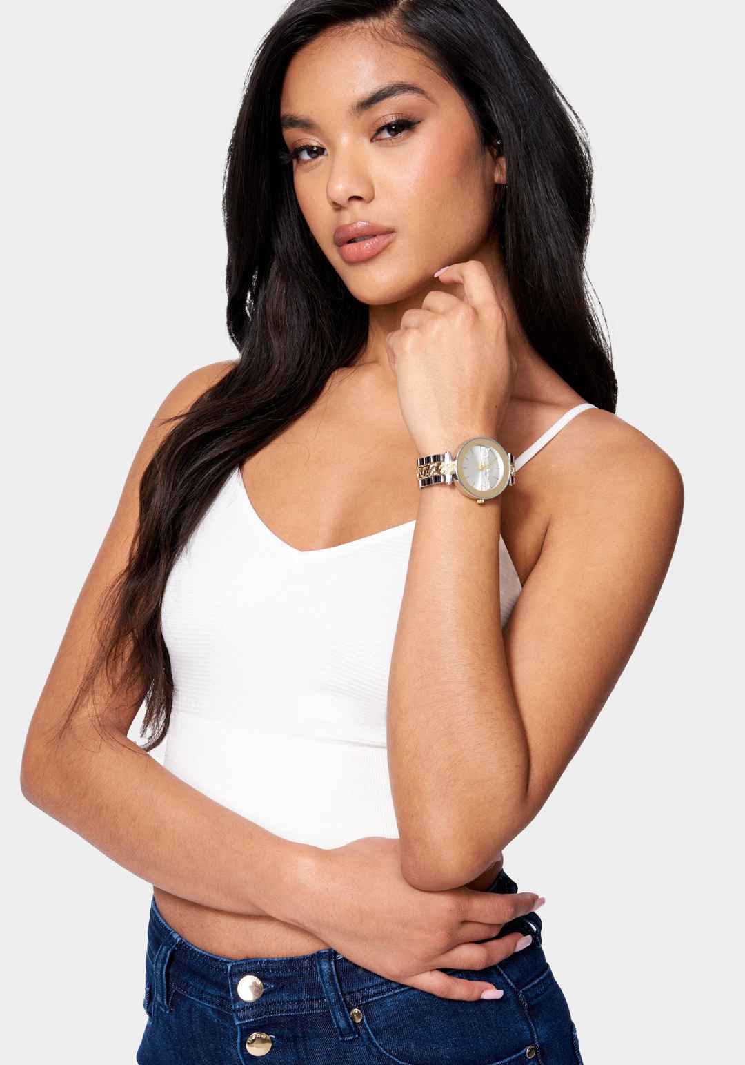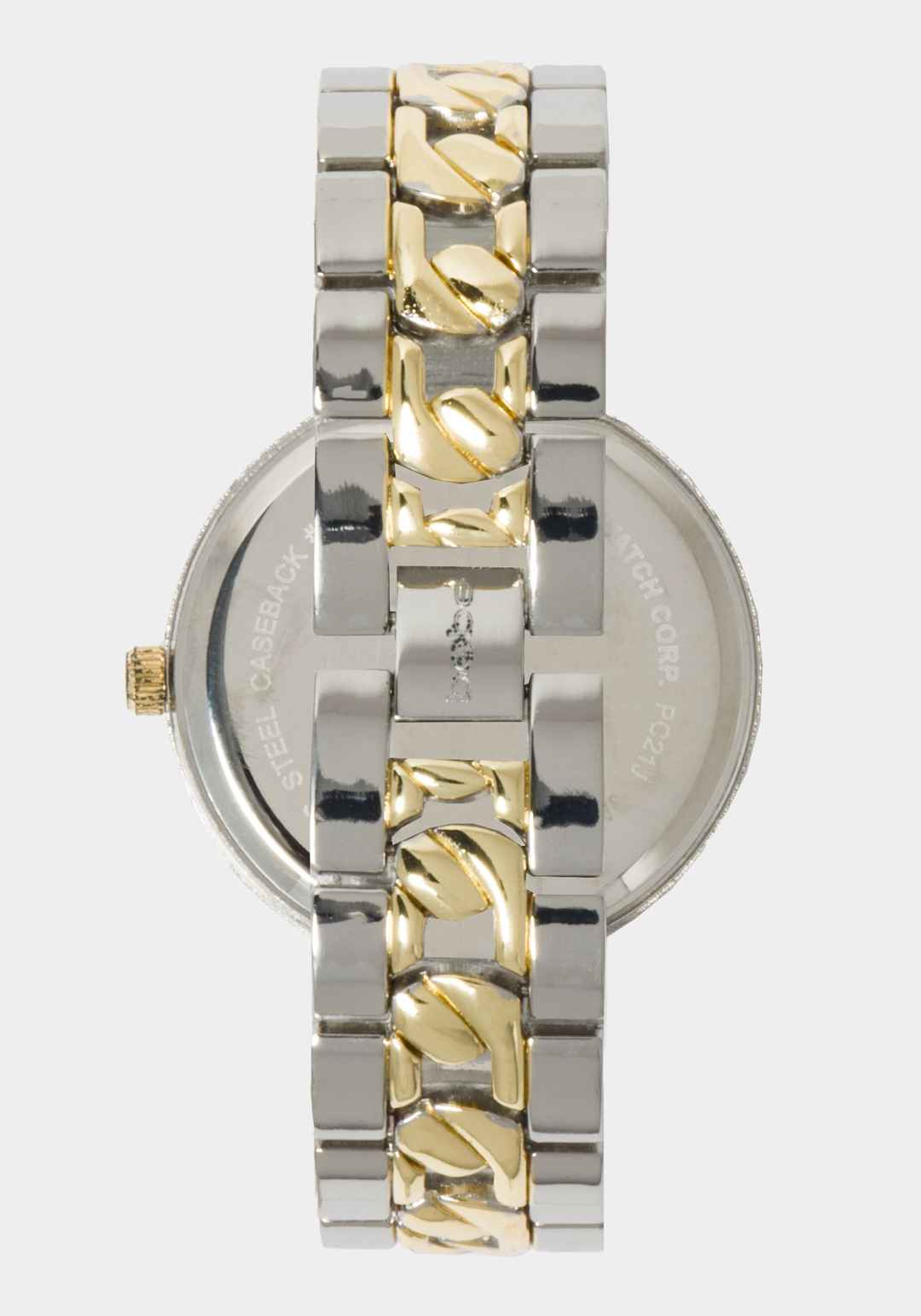 A sleek statement. This two-tone bracelet design features a smooth gold-tone bezel, a crystal logo, and clear pav crystal accents along the chain. Spot clean Imported | Bebe Women's Silver Smooth Dial Smooth Bezel Watch in Two-Tone Gold-Silver