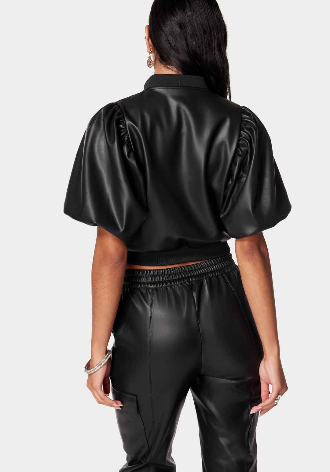 Our vegan leather zip front jacket is a high-fashion, ethical choice for your wardrobe. This jacket features a sleek zip front styling, giving it an edgy yet sophisticated look. 100% Polyurethane: Lining: 100% Polyester Hand wash. Hang to dry. Imported 19" Length | Bebe Women's Vegan Leather Zip Fro...more