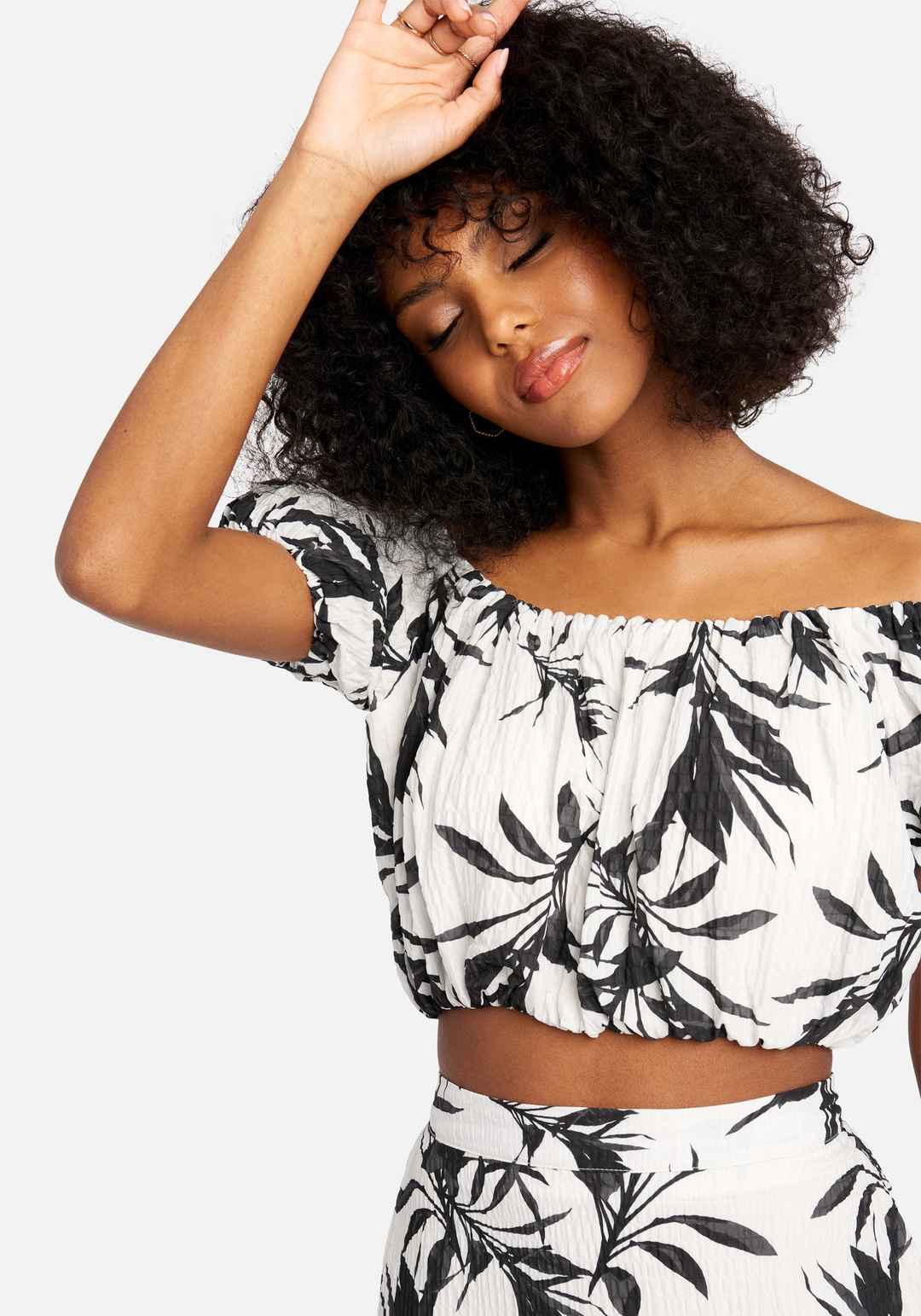 The perfect breezy spring top is here. In an off-the-shoulder silhouette, this ruched bubble top features an allover floral print, short sleeves, and an elasticated hem. Make it a matching set with the Tiered Flowy Printed Maxi Skirt and your favorite heels. Body:100% Polyester; Lining:100% Cotton H...more