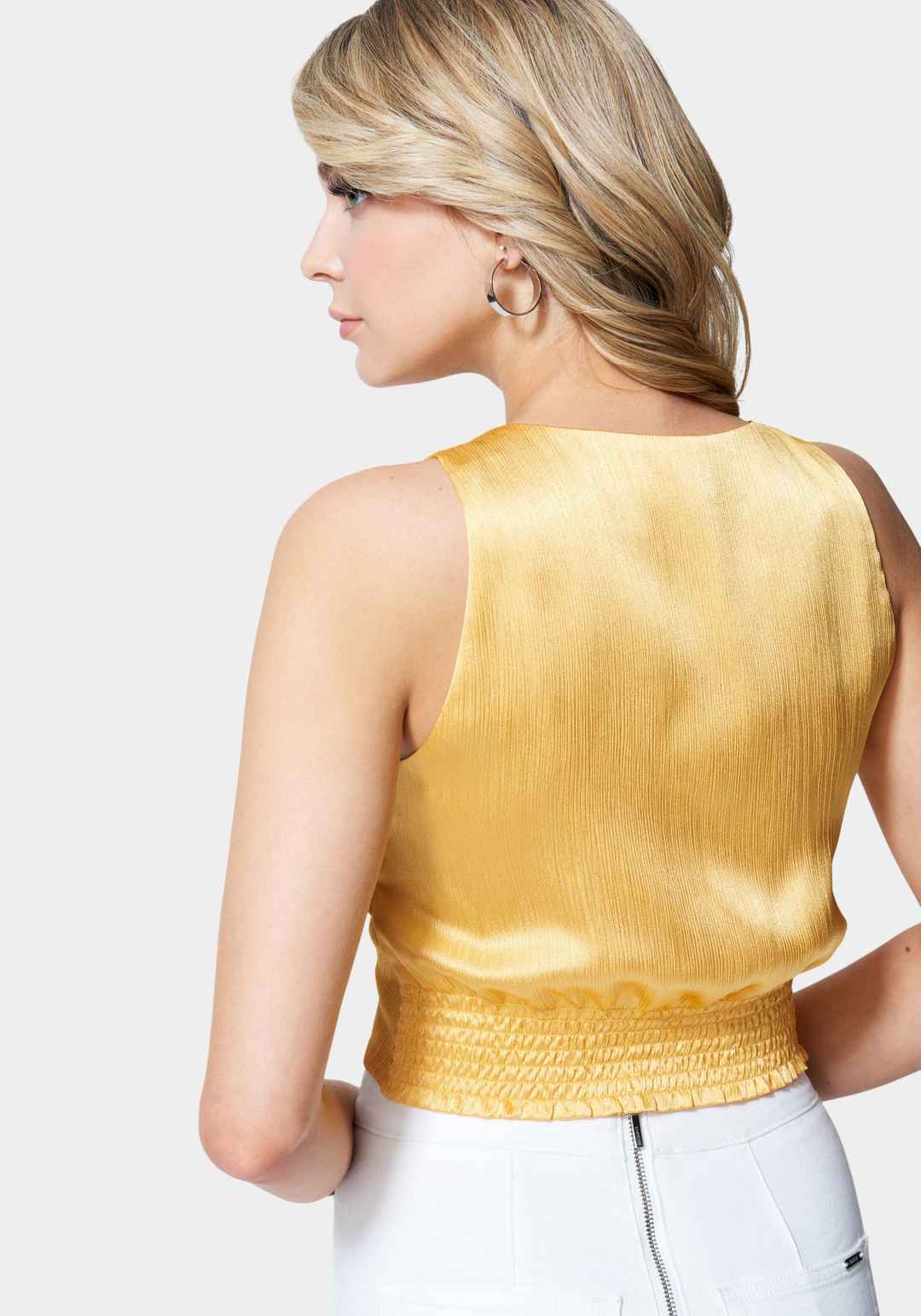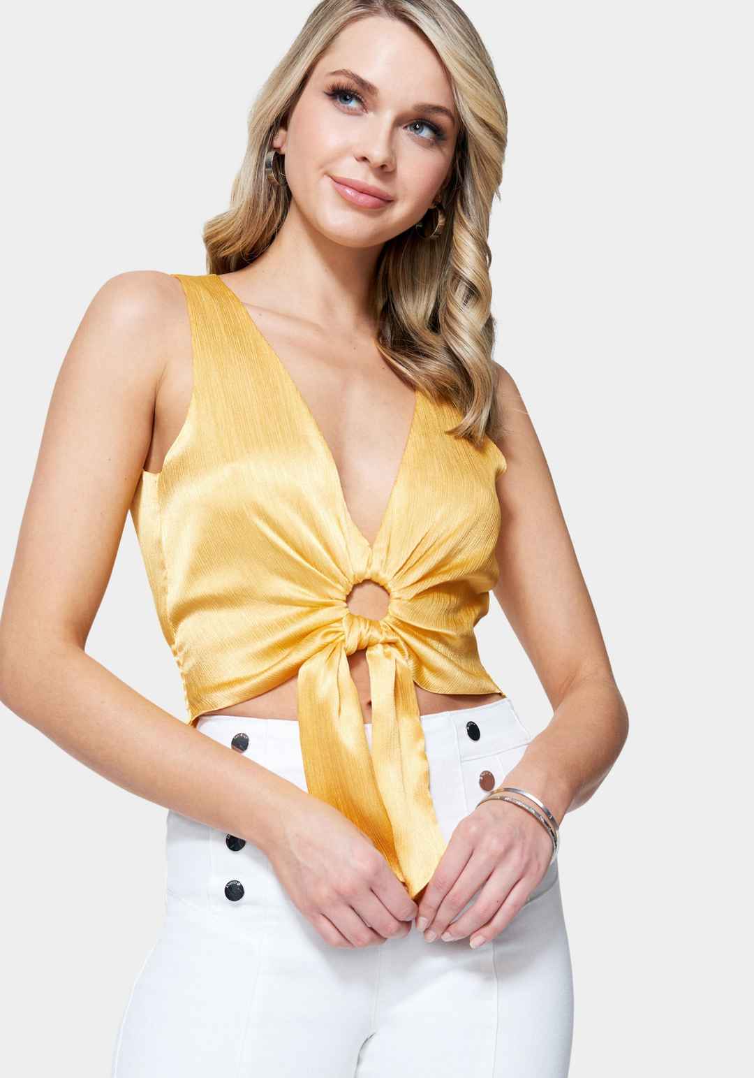 Dare to stand out in this statement V Neck Ring Detail Woven Top. Featuring a cutout design and a cropped length, it's perfect for styling seamlessly with your existing wardrobe pieces. The back is smocked at the waist for added glam and comfort. 100% Polyester; Lining: 100% Polyester Hand wash. Han...more