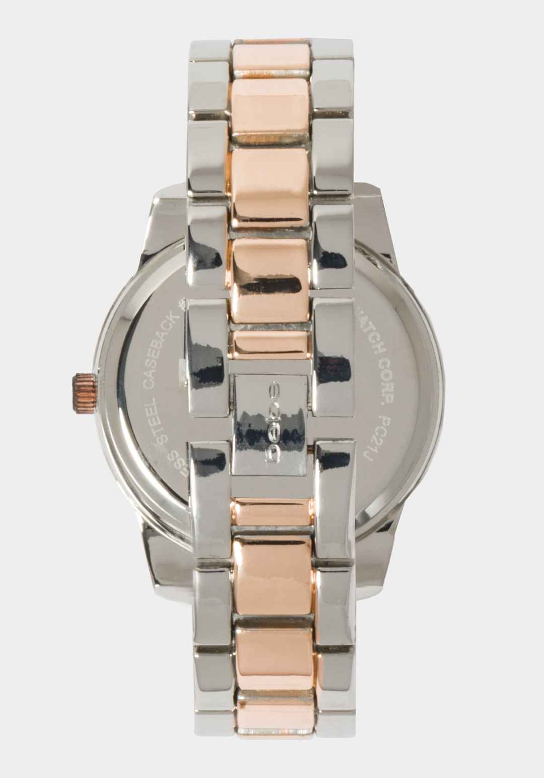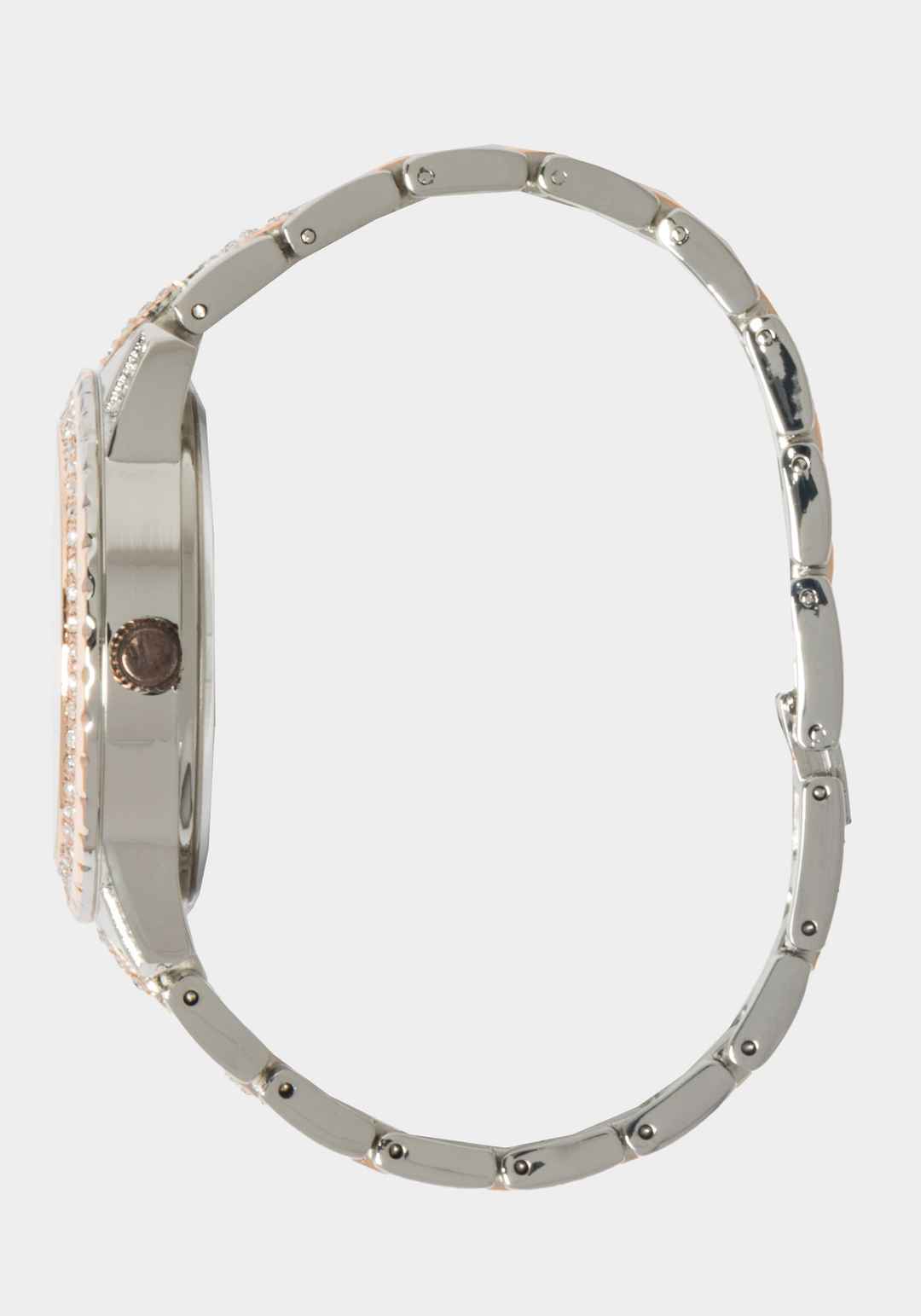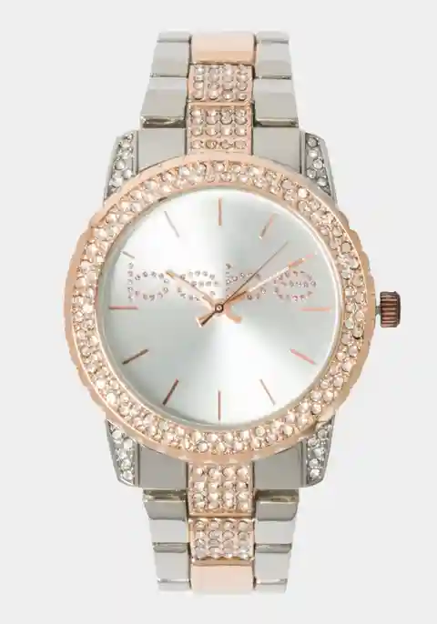 Fashion meets function in this bold two-tone bracelet design. Features rose gold and silver finishes, complete with crystals on the bezel, crystal logo on the face, and clear pav crystals along the chain. Spot clean Imported | Bebe Women's Silver Smooth Dial Crystal Bezel Watch in Two-Tone Rose Gold...more