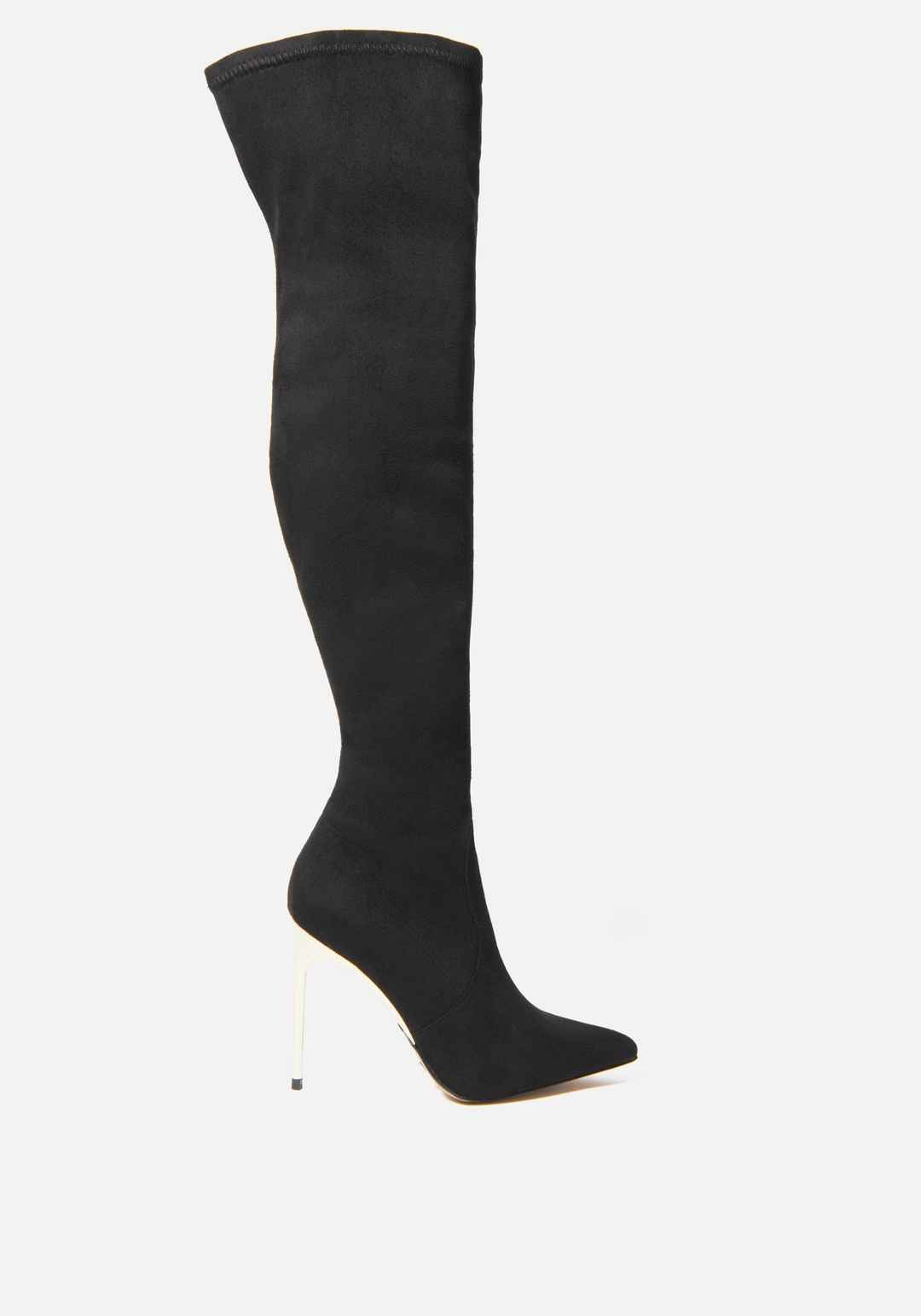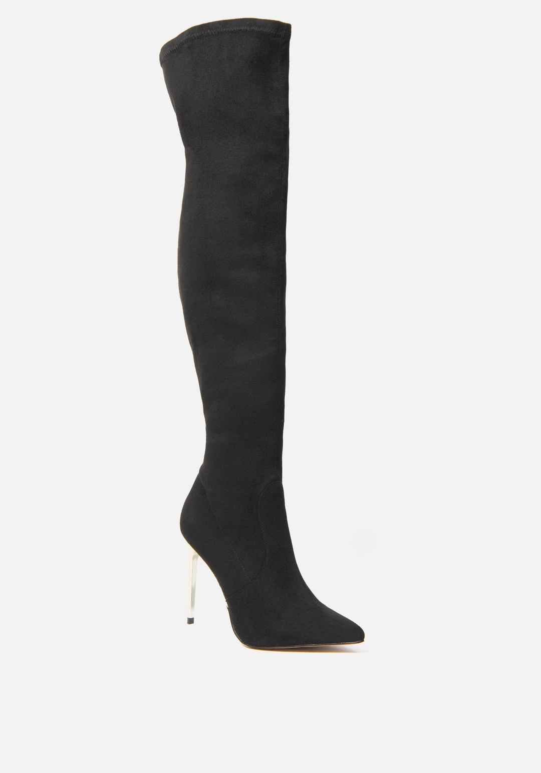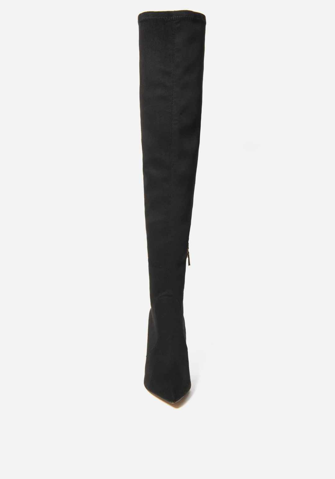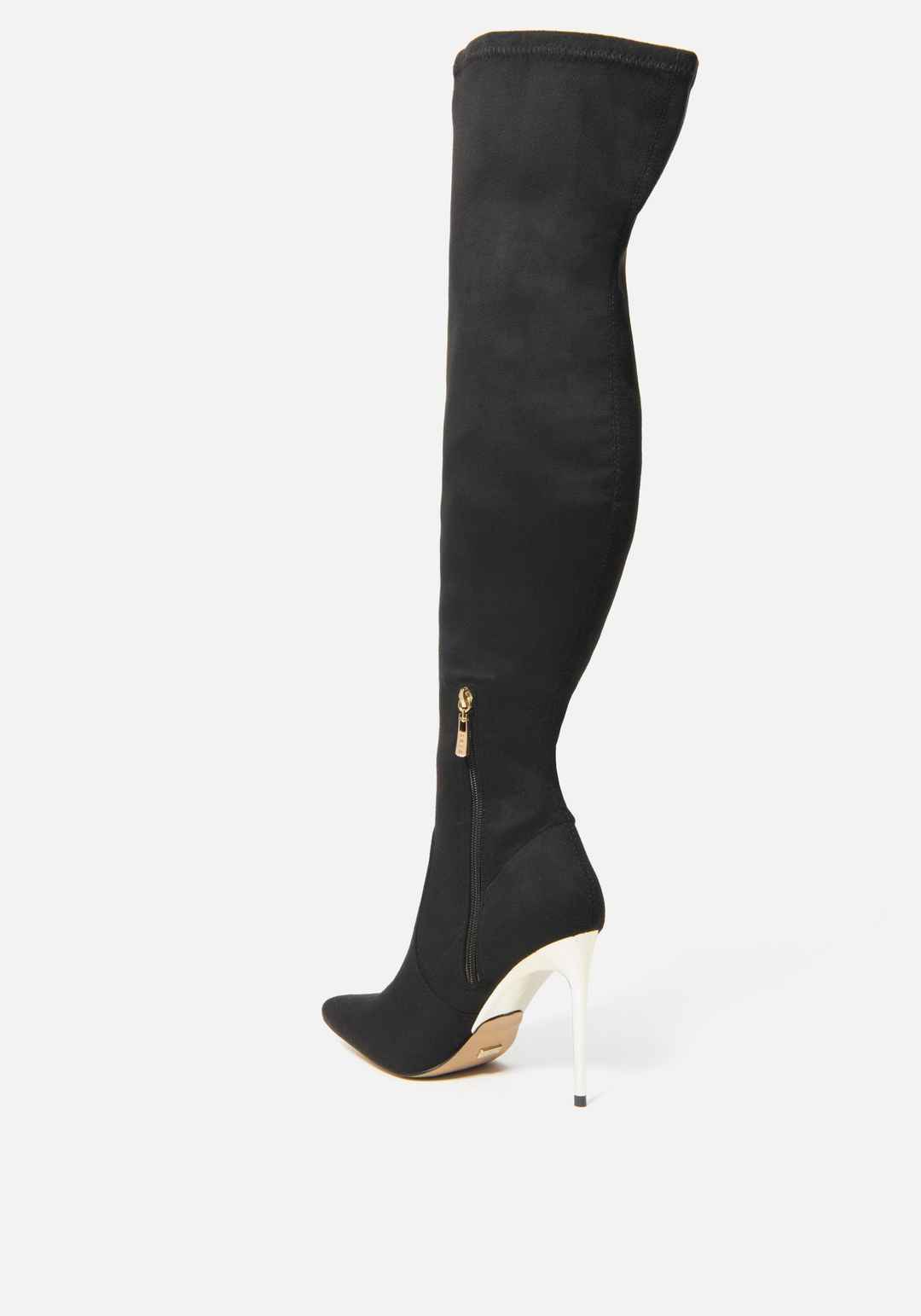 Step up your shoe game with these over-the-knee boots, featuring a pointy toe and stiletto heel. Upper: High-quality imitation leather. Outsole 100% Synthetic. 4" Heel Spot clean only Imported | Bebe Women's Valirya Over the Knee Boots, Size 6.5 in Black Suede Synthetic