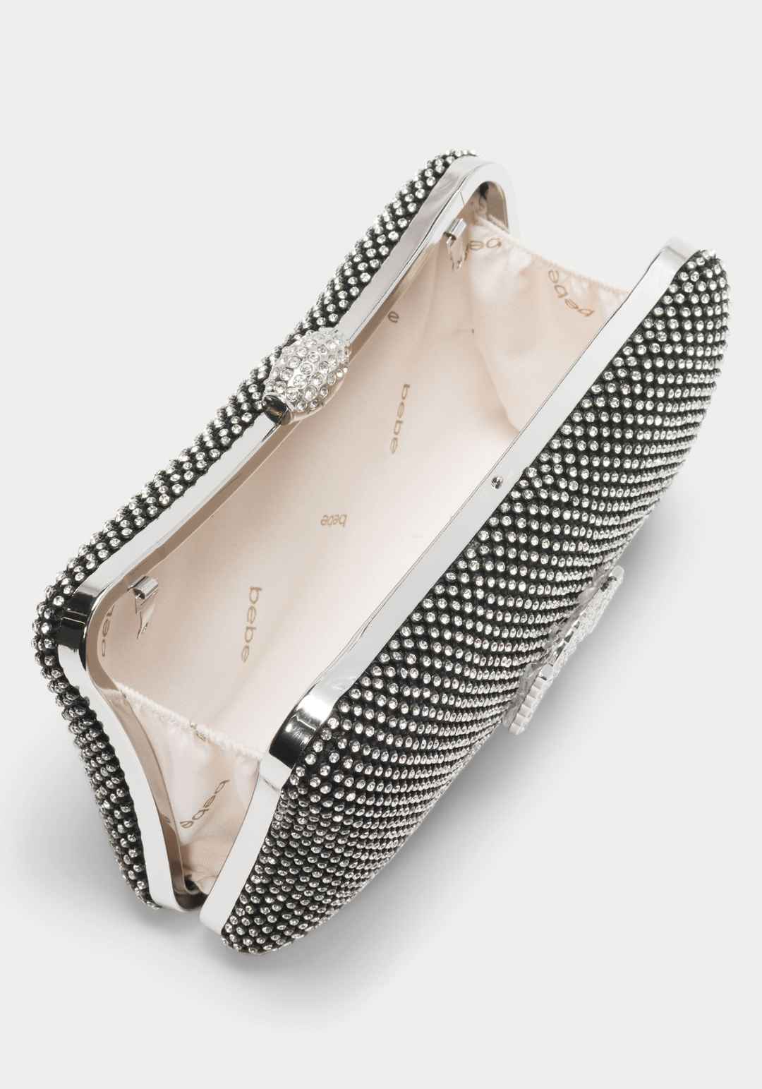 Turn heads with the Bebe Dianna Hardshell Diamond Clutch. The sparkling diamond-shaped design and clasp opening create a stunning visual appeal, while the removable shoulder strap allows for versatile styling options. Whether you're attending a gala or a cocktail party, this stylish and glam clutch ...more