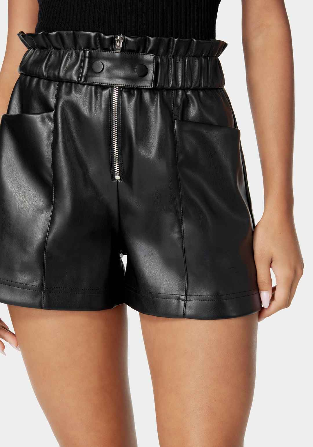 Discover the perfect blend of on-trend and versatile style in our black vegan leather elastic waist zip front shorts. They're designed to make a fashionable statement while providing endless outfit possibilities. 100% Polyurethane Hand wash. Hang dry. 2" Inseam Imported 100% PolyurethaneHand wash. H...more