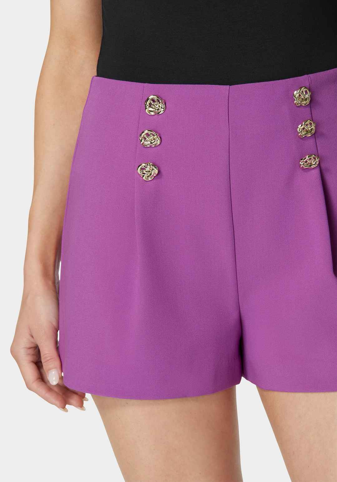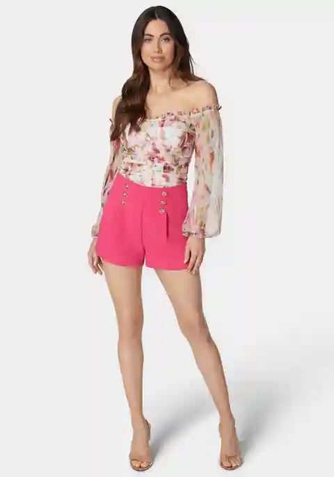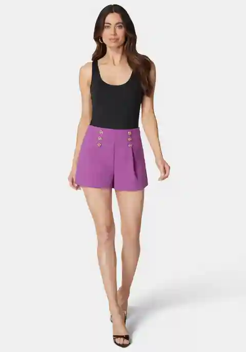 Capture the essence of summer chic with these High Waist Flared Shorts, adorned with eye-catching button details. Perfect for sunny days or pairing with tights for a transitional look. 72% Polyester, 21% Viscose, 7% Spandex Hand wash. Hang to dry. Imported 3" Inseam | Bebe Women's High Waist Button ...more