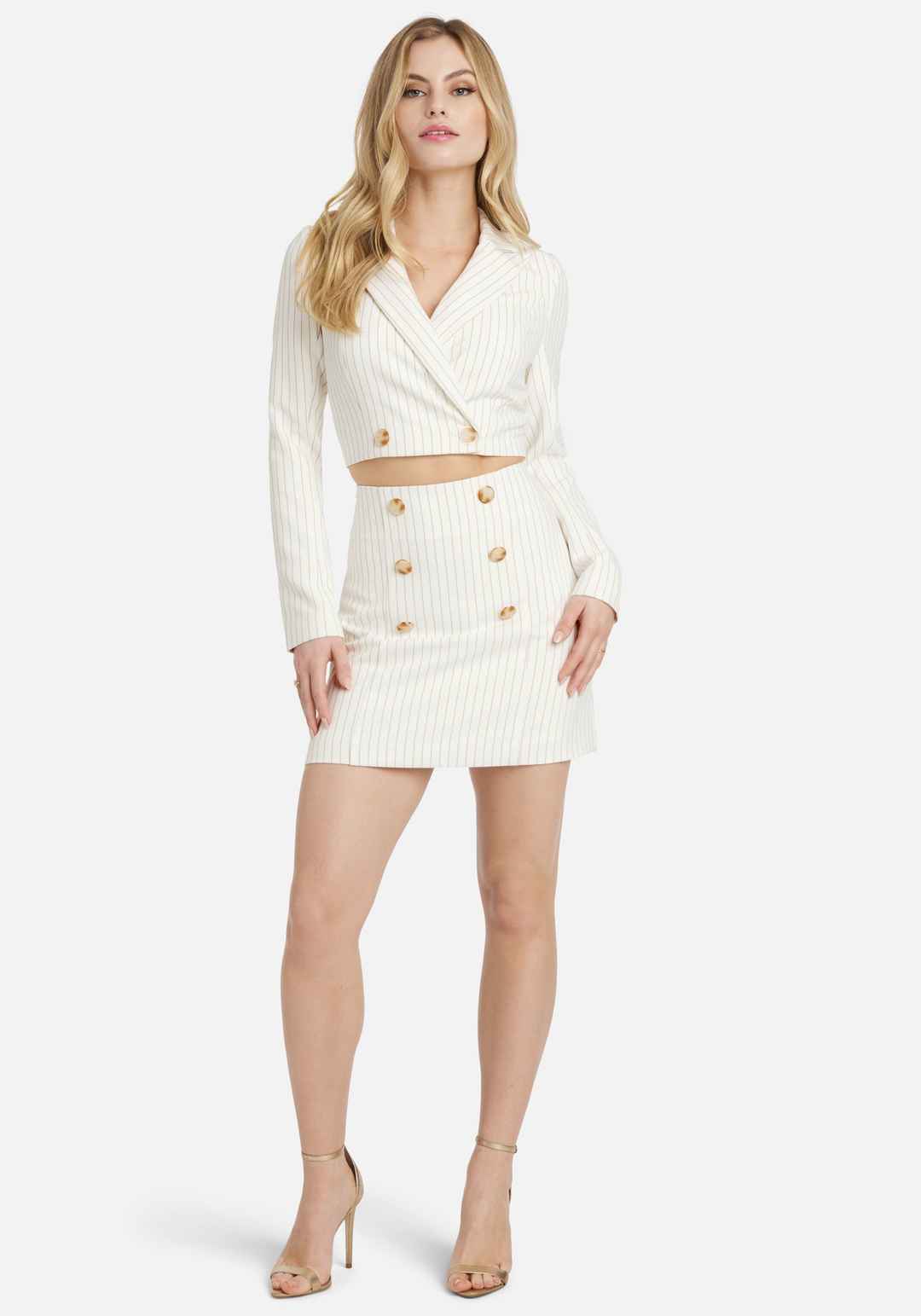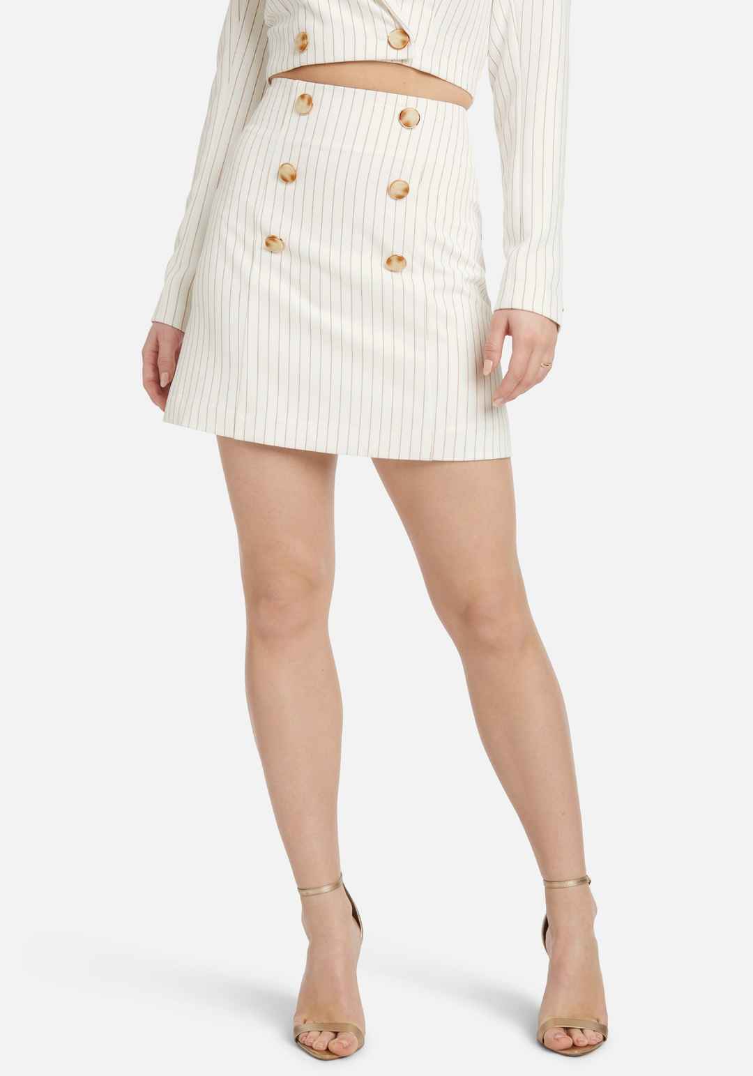 This Stripe Twill Button Skirt features a pinstripe print, gold-tone buttons, and an A-line silhouette that hits just above the waist. Matches with the Stripe Twill Double Breasted Jacket for the perfect work-to-weekend look. Body: 94% Polyester, 6% Spandex; Lining: 98% Polyester, 2% Spandex Hand wa...more